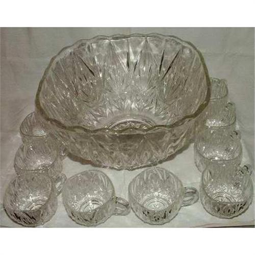 Large Punch Bowl and 12 Cups in excellent condition. Rounded corners in an unusual square design. No nicks, chips or cracks.