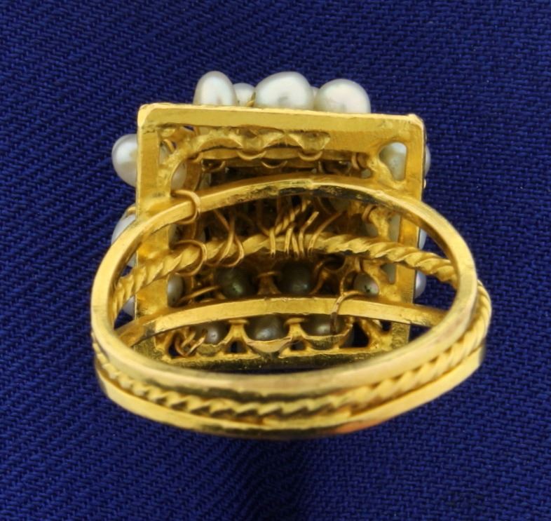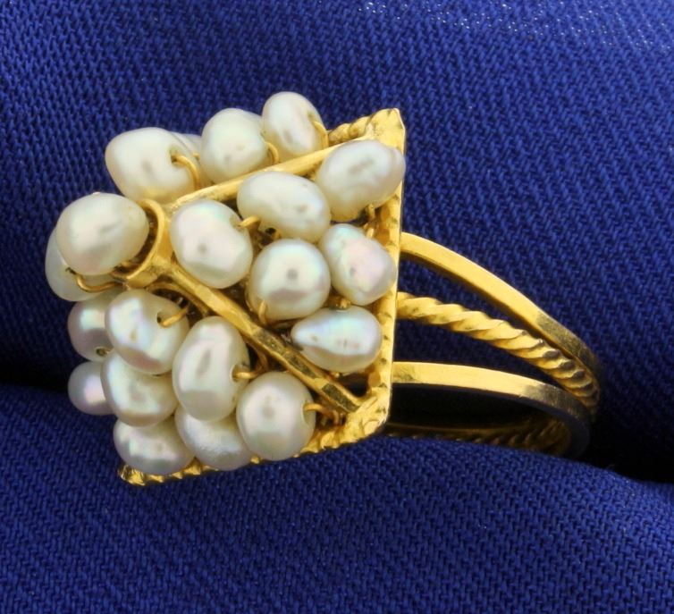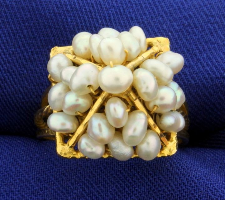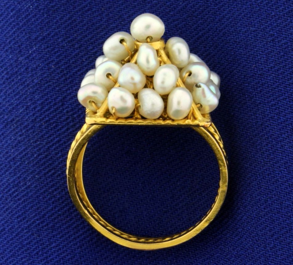 In 18k yellow gold. Contains twenty five 4mm oval shaped high quality pearls with unique silver tone and excellent luster. Unique pyramid design. Size 7 1/2. 7.3g.