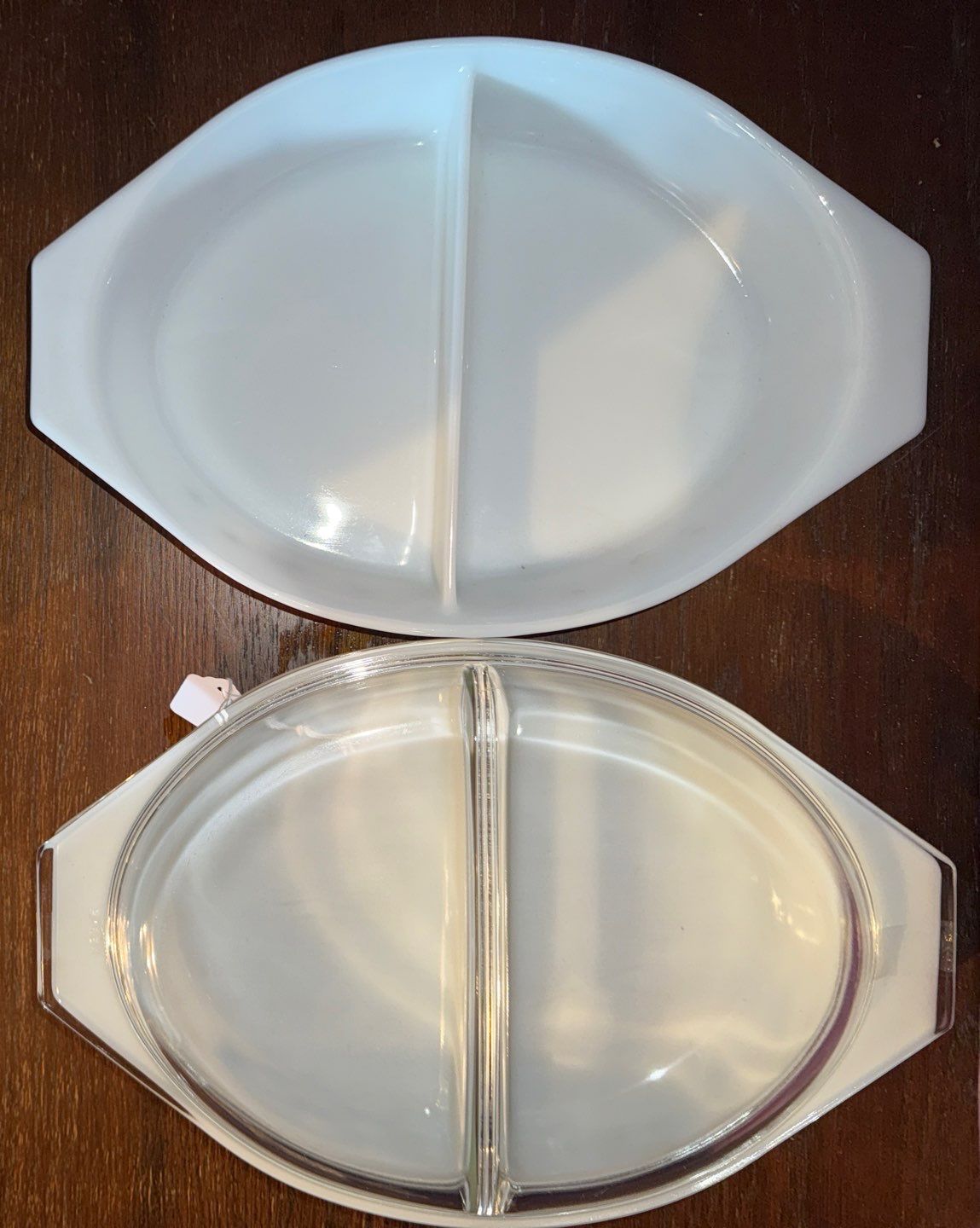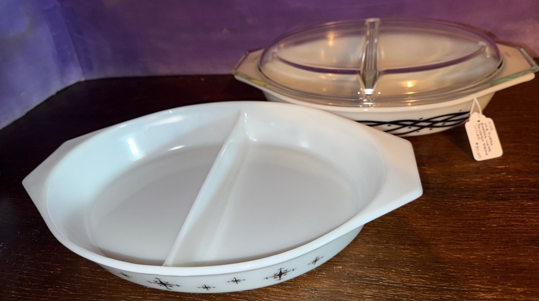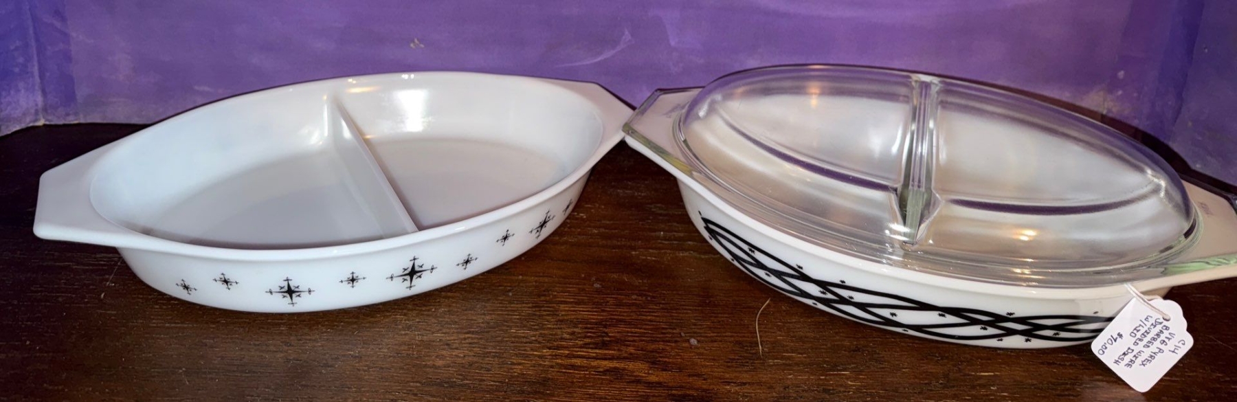 Vintage Pyrex Divided Serving Dish w/One Lid-Black Star, Compass Or Snowflake Pattern