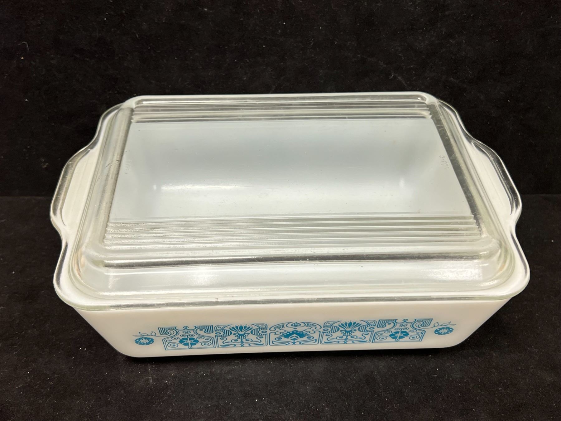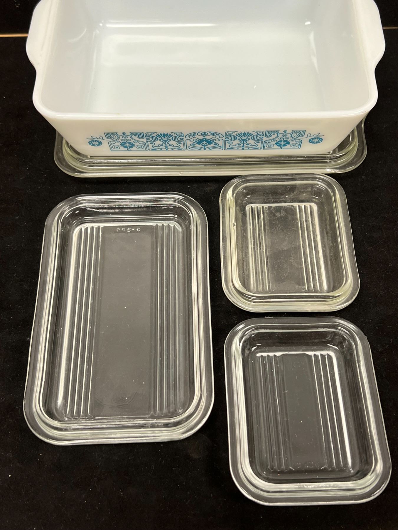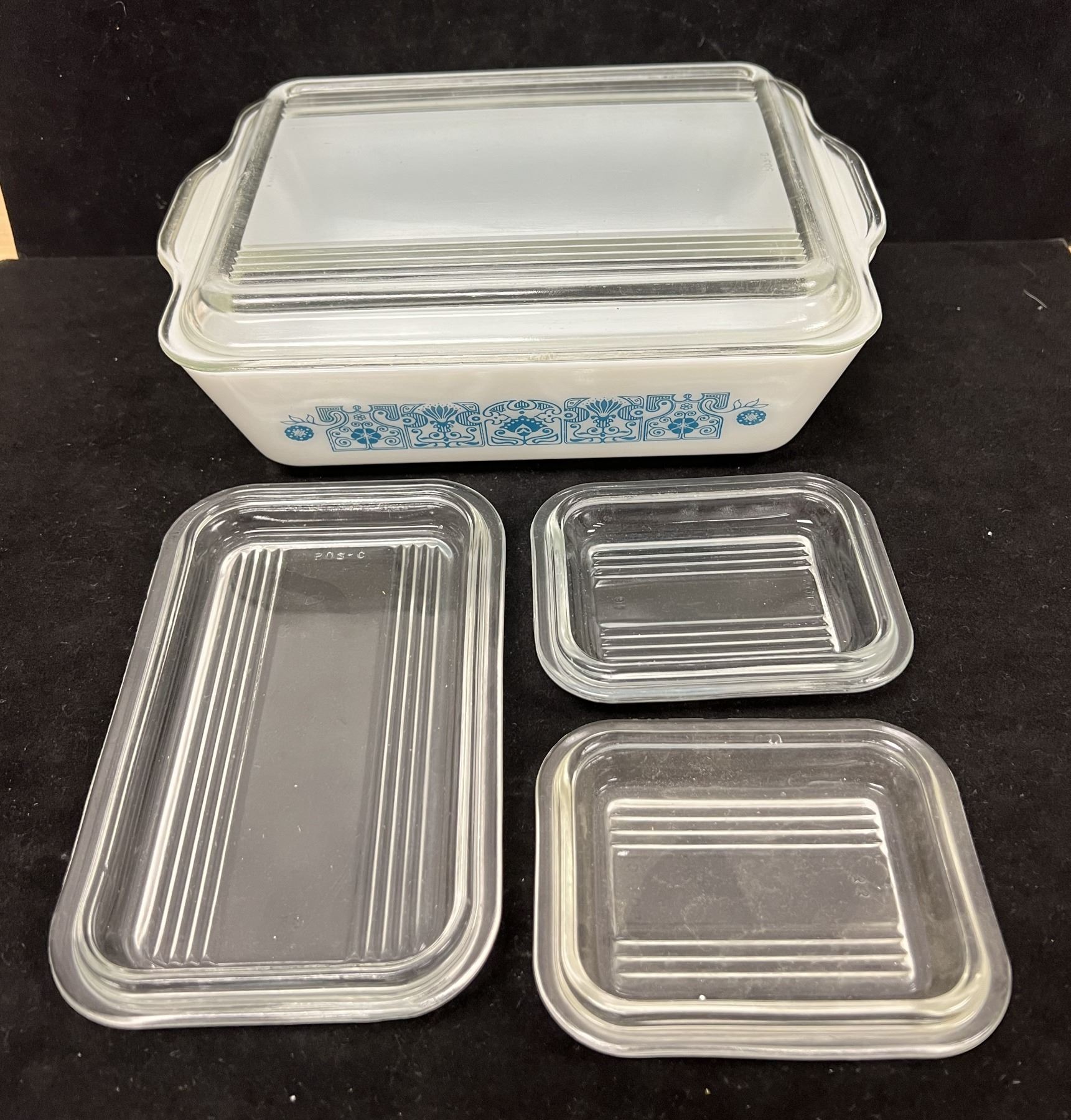 Vintage Pyrex Horizon Blue 0503 Refrigerator Dish with Lid & Extra Lids as pictured. Dish has a rough spot close to one corner (see photos). Lids are good overall, small knicks.