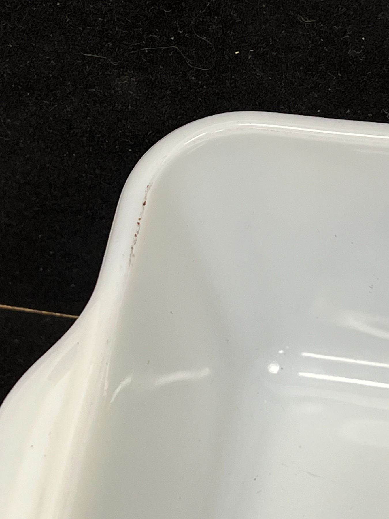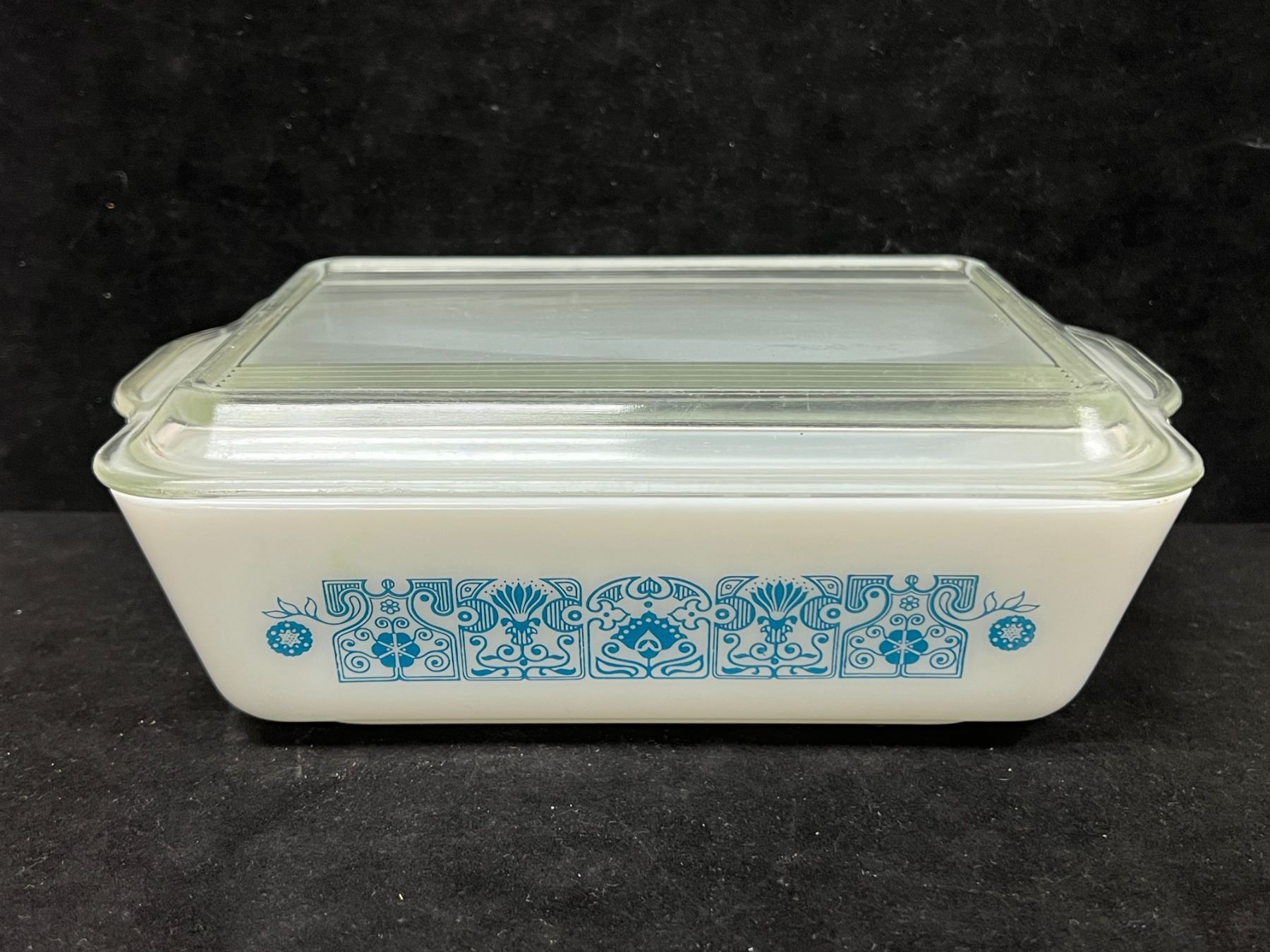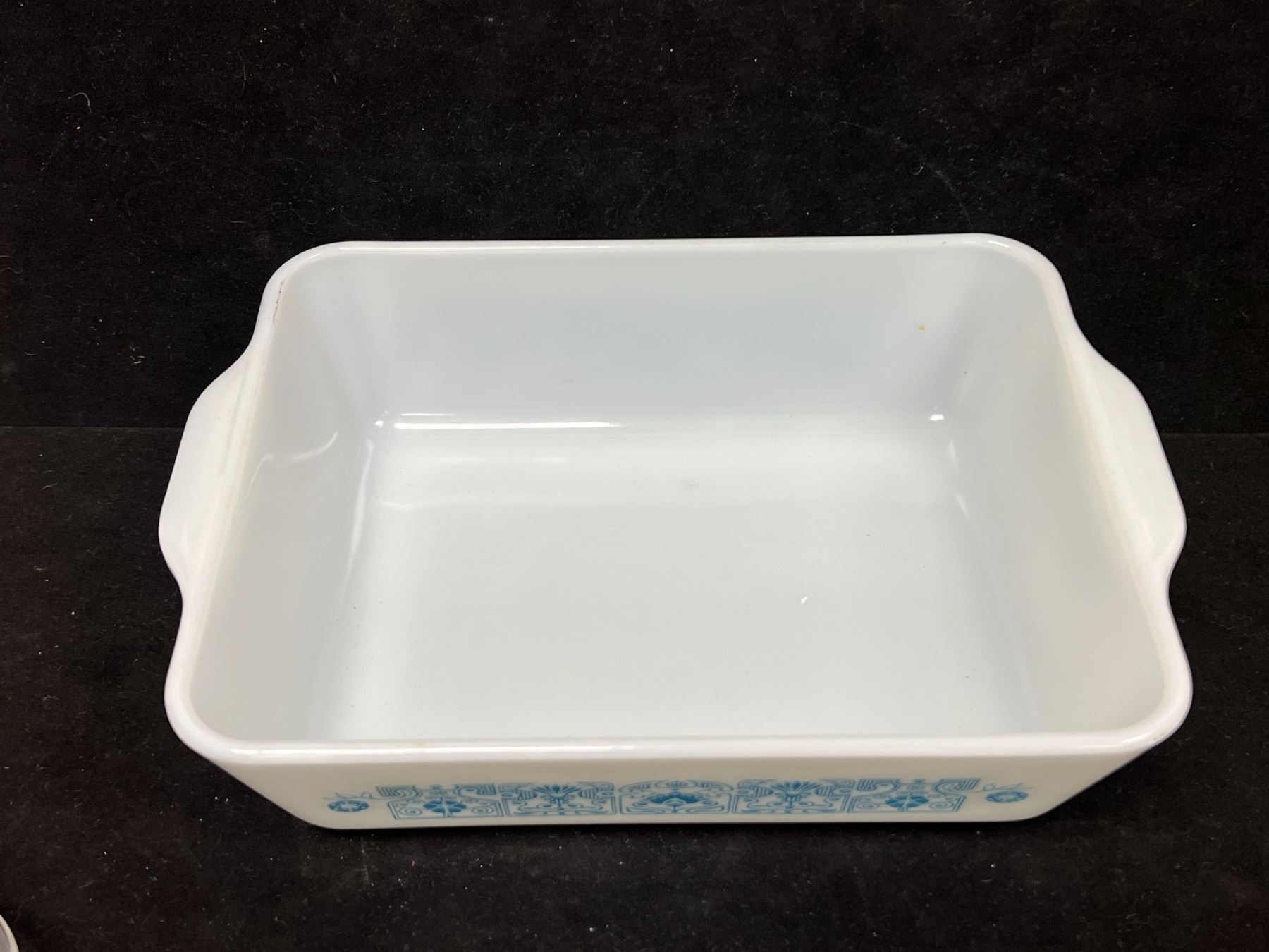 Vintage Pyrex Horizon Blue 0503 Refrigerator Dish with Lid & Extra Lids as pictured. Dish has a rough spot close to one corner (see photos). Lids are good overall, small knicks.