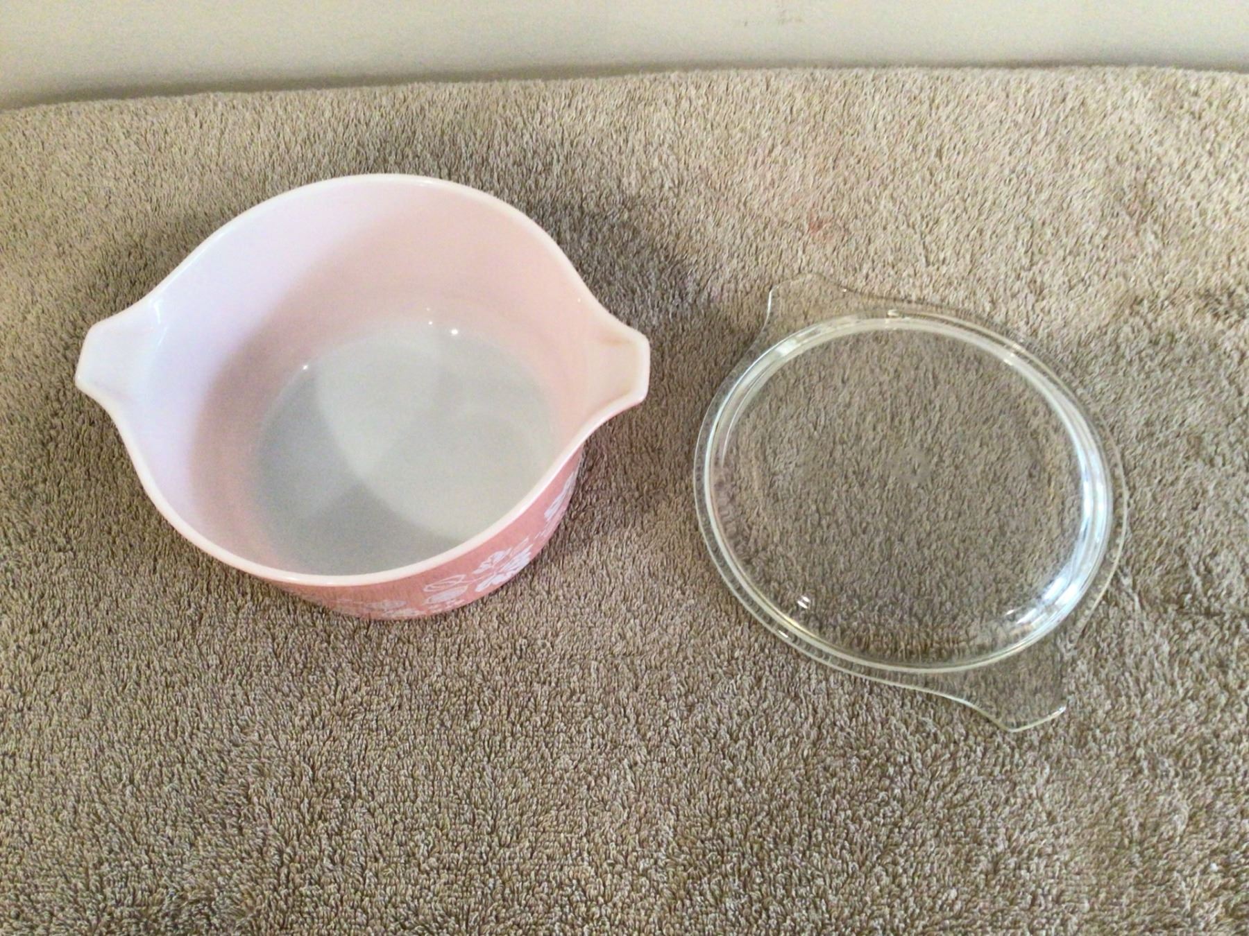 Vintage Pyrex pink gooseberry #476 1 qt. casserole dish with lid #470-C. Excellent cond.
