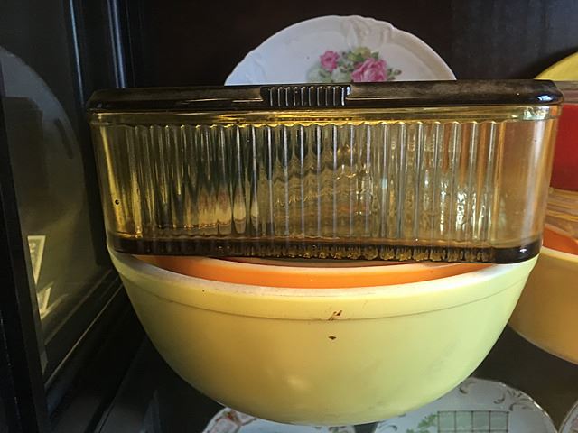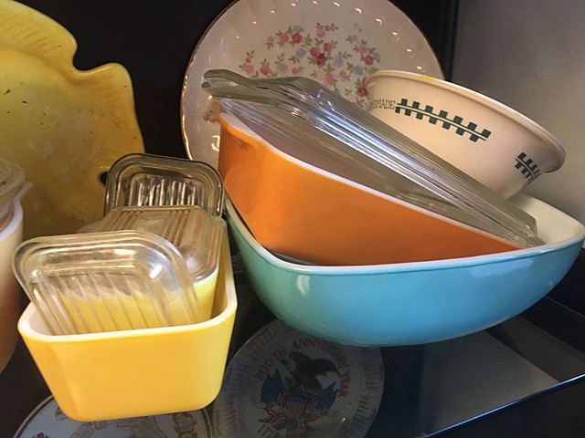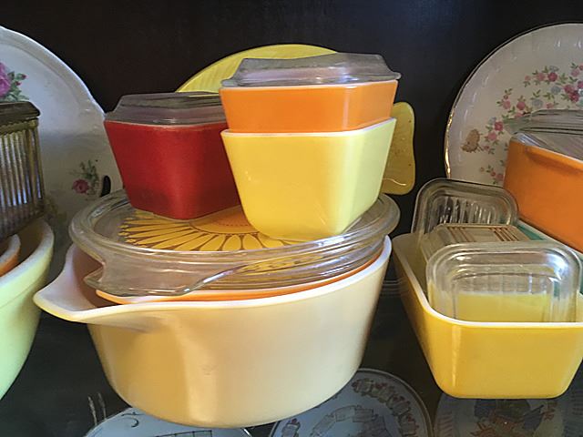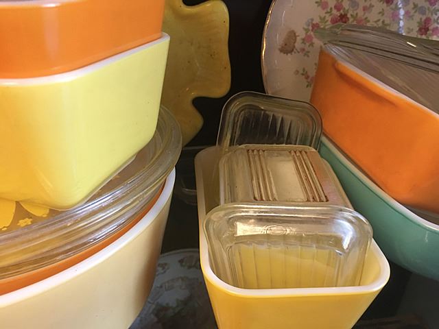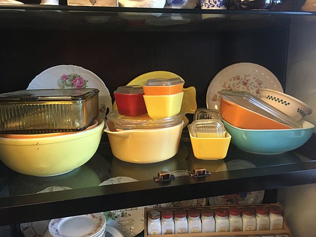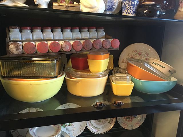 Vintage Pyrex including bowls (nesting mixing bowls, covered cassarole dishes, covered bowls, small covered bowls, glass cassarole dish, and vintage spice rack, all fresh off the farm!