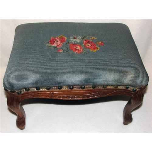 Vintage / antique Queen Anne style needlepoint stool with carved cabriole hardwood legs. The needlepoint is Wedgwood blue with red, pink, and blue flowers, and is cushioned and attached to the stool with upholstery tacks. The stool measures about 9.5 inches high, 14.75 inches wide, and 10.75 inches deep. It is in very good condition, with minimal to light wear, and a slight depression in the center of the cushion. Please refer to the 4 photographs for appearance and condition. Shipping / packaging costs will be $15.00 - $20.00 in the lower 48 states, based upon the zip code of the buyer.