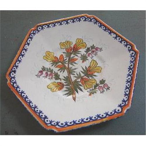 Beautiful vintage Quimper handpainted saucer/plate, hexagon shape. Very good condition. No cracks/chips/repairs, just some minor flaking to the rim. Lovely handpainted flowers and rich blue border. It's a lovely old Quimper piece. Marked on the underside.