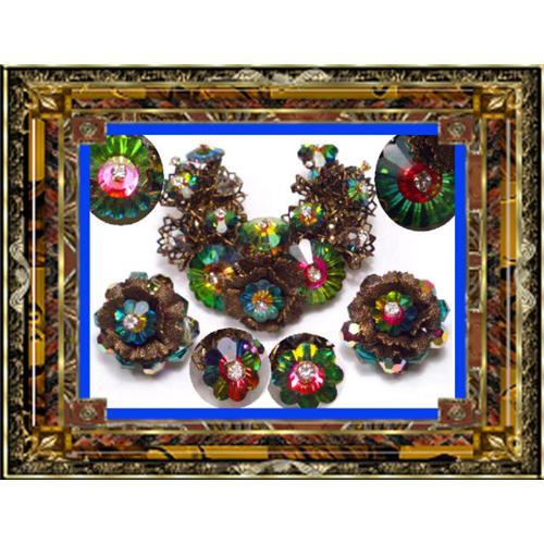 WOW! This has to be the most extreme cluster brooch with antique florette margarita rivoli prism stones that are HUGE!! Nothing but the best for a designer who is known for putting different types and sizes of glass stones and making something SPECTACULAR!.If you know anything about rivoli stones, besides the fact they are pointed like prisms and have colors like kaleidoscopes Not to mention the rhinestone headpins that hold all this together. The brooch is large ( almost 3?) and is really thick ( 1?). The patina on the filigree is dark so these BRILLIANT Peacock color stones stand out and look like fire and water. The matching earrings have florette shaped rivoli stones set in the same raised glass rivoli stones. One of a kind, this is one tremendous set!! . EVEN prettier than the photos this is a set you will treasure!! This is a set with all its original stones and is made in so many layers that you just keep looking and seeing more glitz. . The set is in very good condition and I promise you that you will get MANY MANY compliments on this when you wear it. It is as nice as SCHIAPARELLI pieces, if not better. In very good shape it is unsigned