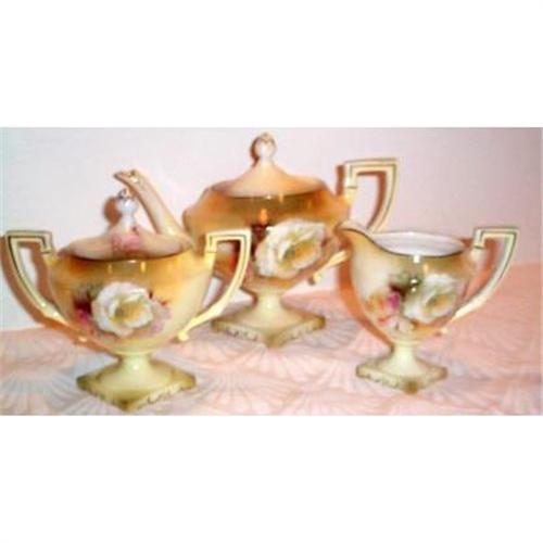 We are offering you this complete VINTAGE RS Prussia Tea Set all for one money. The Tea Set will consist of the Tea Pot and lid and they are both in SUPERIOR condition with no chips, cracks, dings or hairlines and the teapot measures 8" from spout to handle and stands a stately 6" tall to the top of its lovely finial. The covered sugar is also in SUPERIOR condition with no chips, cracks, dings or hairlines and it measures 5.875" from handle to handle and stands 5.50" tall to the top of its finial and the footed creamer is also in SUPERIOR condition with no chips, cracks, dings or hairlines and it measures 4.50" from spout to handle and is 3" in diameter and stands about 4.50" tall. They are all marked on the bottom with the vintage red RS Purssia mark. We GUARANTEE these to be vintage RS Prussia.