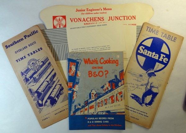 Includes "What's Cooling on the B & O?" Popular recipes from b & O Dining Cars.., Southern Pacific Time Tables for 1940 and Santa Fe Time Table for 1965.