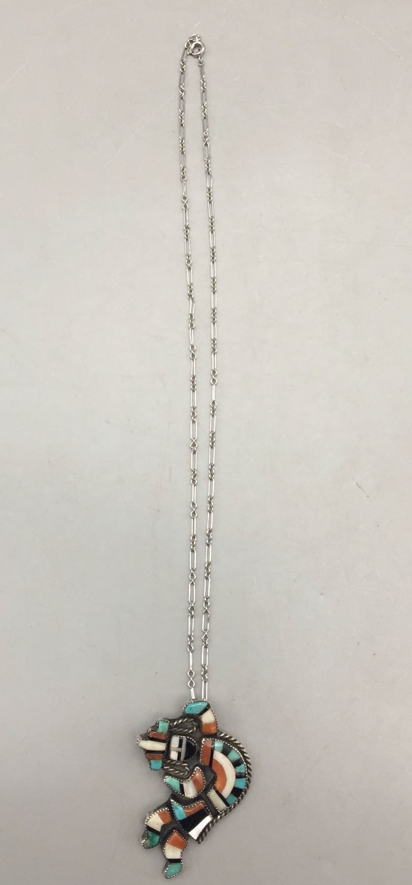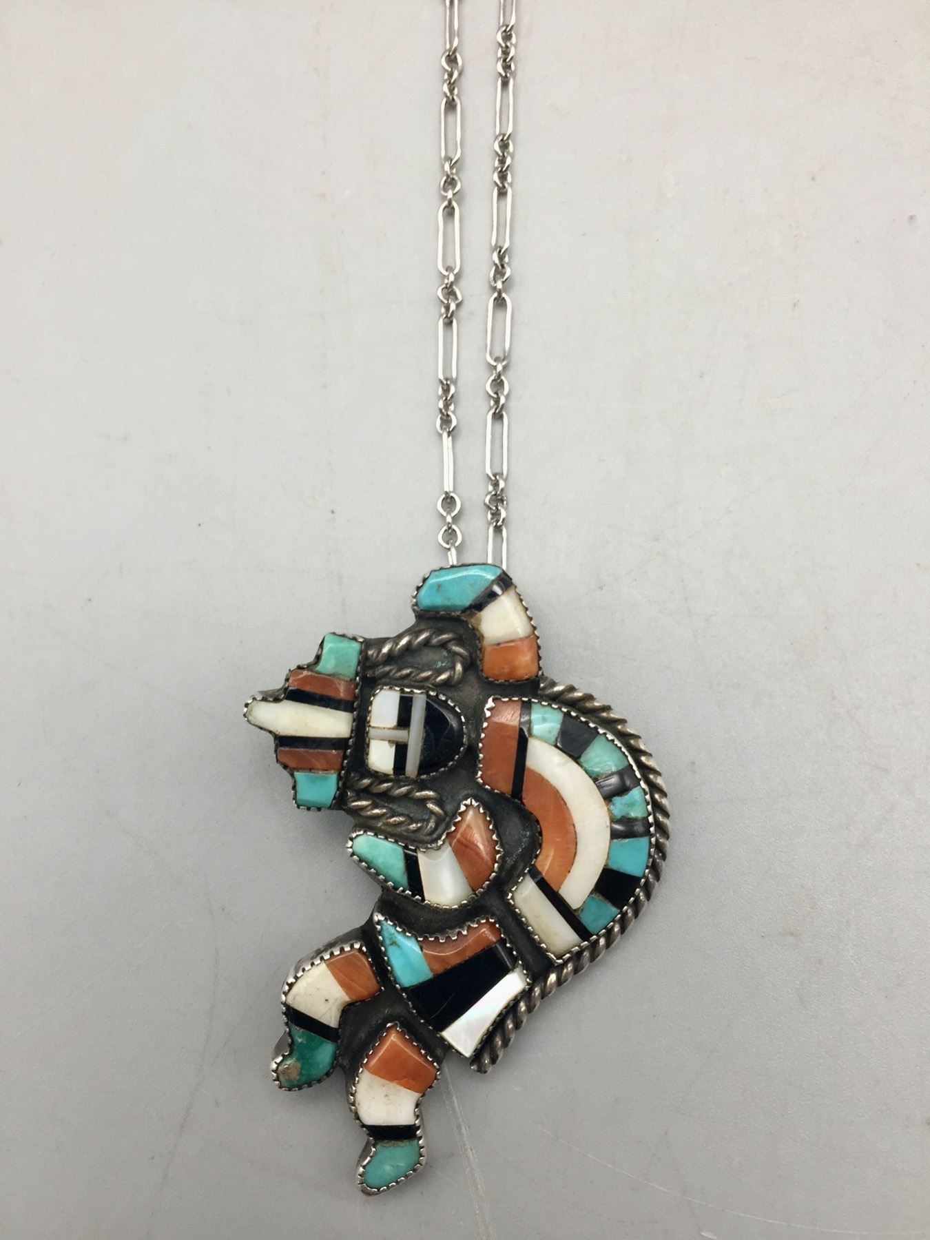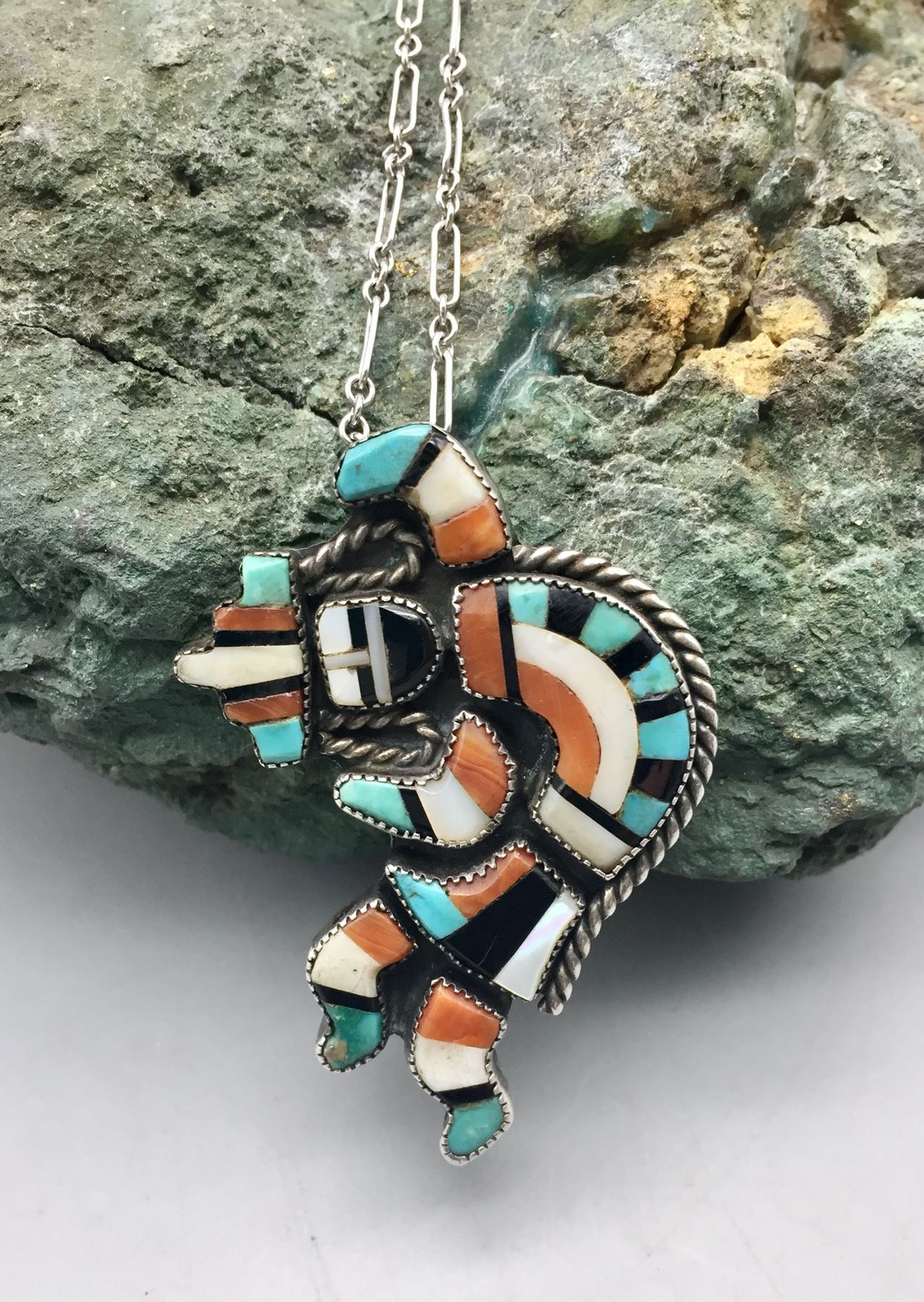 Description: Offered for sale in this lot is an amazing Zuni inlay pendant. It features the rainbow-man character. Set with turquoise, coral, onyx, and mother of pearl in sterling silver. Maker: Unknown Approx. Age: Vintage. Size: Fits a 16” neck. Pendant is an additional 2” long x 1-3/8” wide. Weighs 14.7 grams. Condition: Good for its age, normal wear expected. Please look closely at the pictures - they are an important part of our description. Shipping: There will be a $5 handling / packaging fee for shipping this lot. The actual cost of postage will be added on top of that.