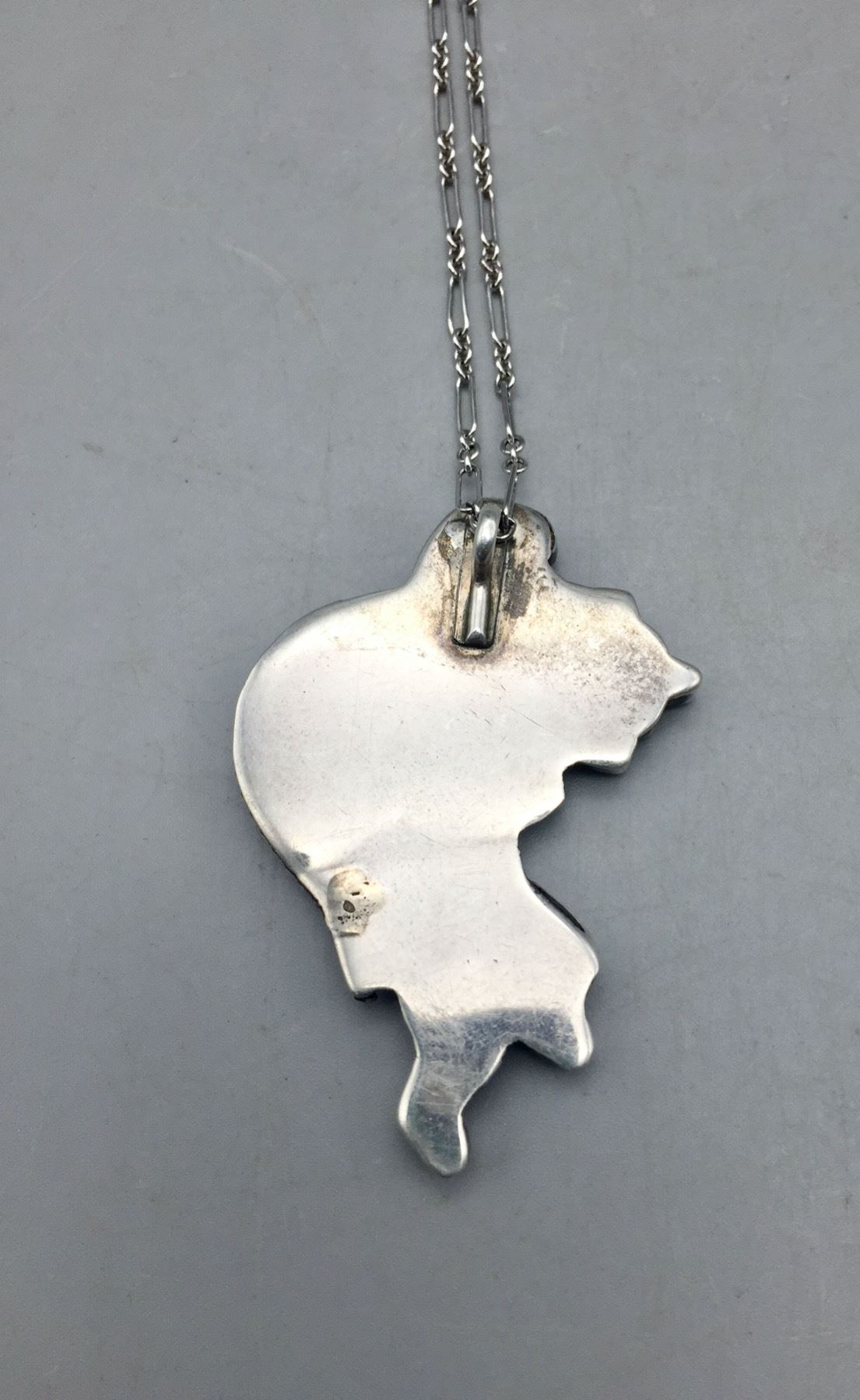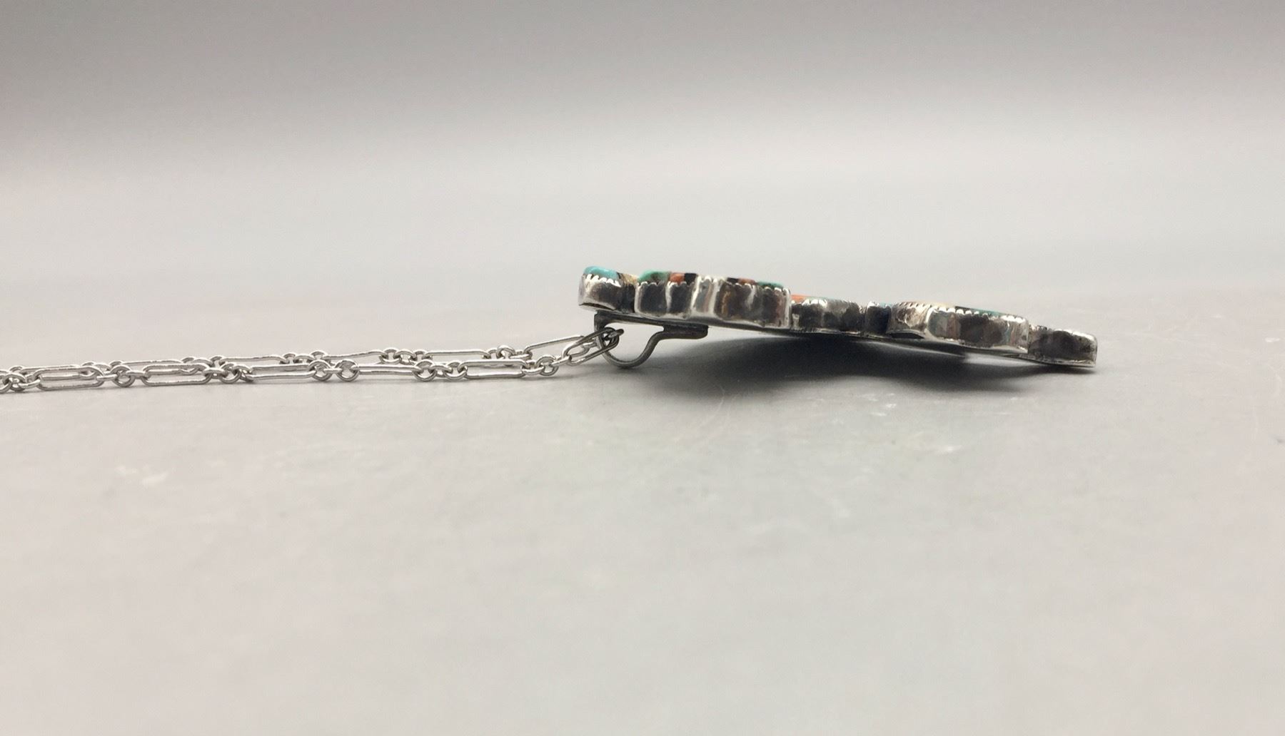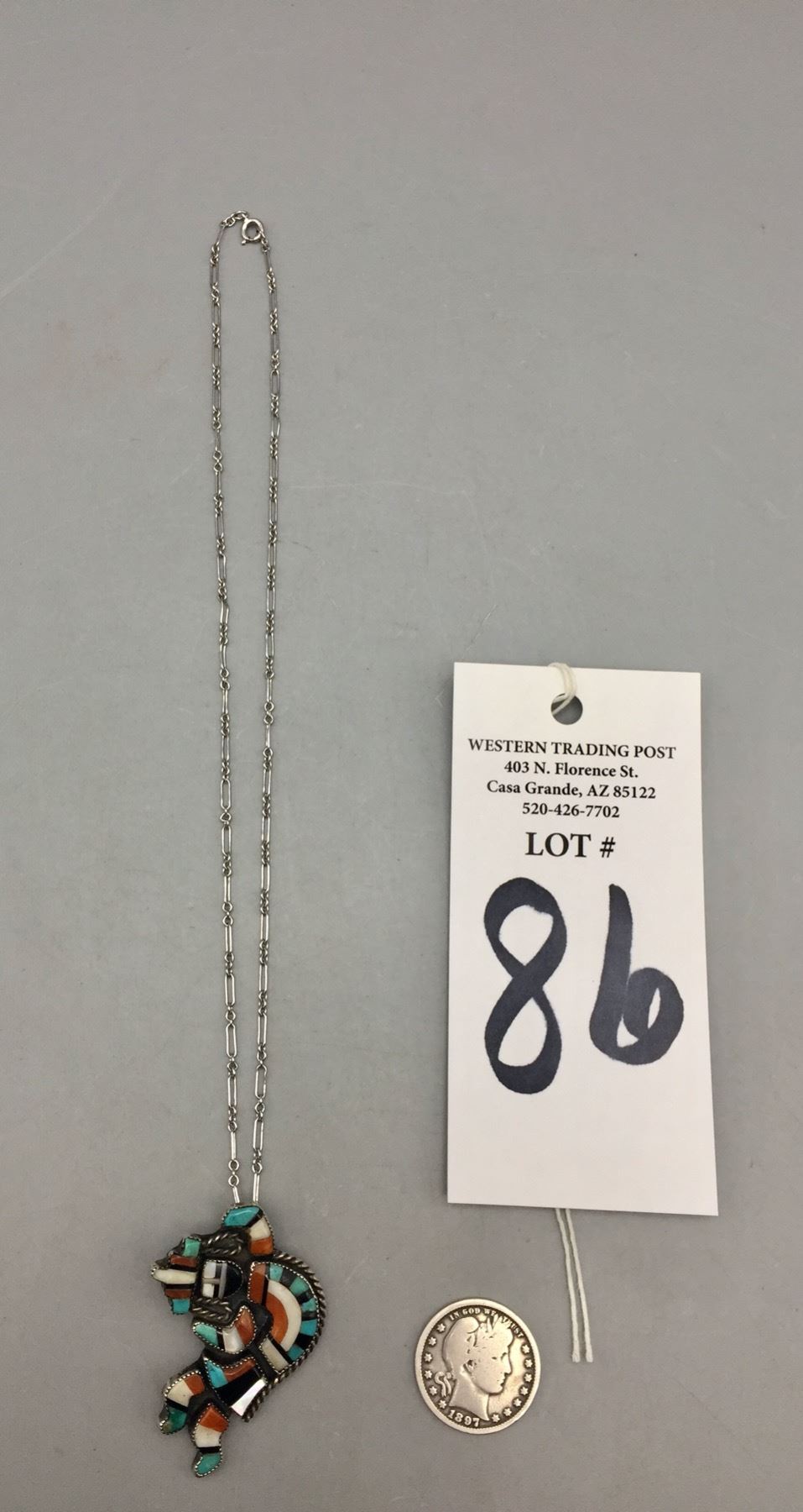 Description: Offered for sale in this lot is an amazing Zuni inlay pendant. It features the rainbow-man character. Set with turquoise, coral, onyx, and mother of pearl in sterling silver. Maker: Unknown Approx. Age: Vintage. Size: Fits a 16” neck. Pendant is an additional 2” long x 1-3/8” wide. Weighs 14.7 grams. Condition: Good for its age, normal wear expected. Please look closely at the pictures - they are an important part of our description. Shipping: There will be a $5 handling / packaging fee for shipping this lot. The actual cost of postage will be added on top of that.