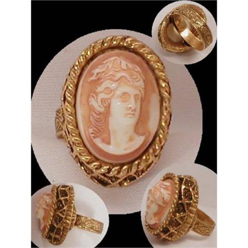 This is such an unusual raised cameo ring that is really very pretty. Her setting is 1" long and she raises up off your finger 3/4". The ring will go to an 8 and is in excellent condition.