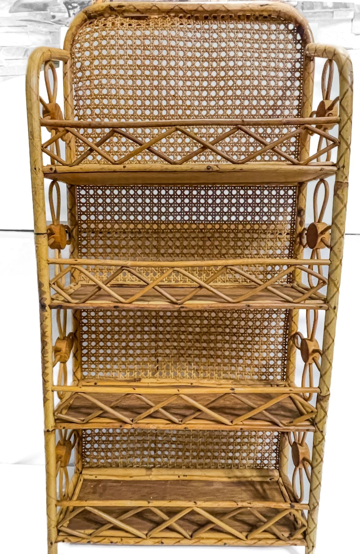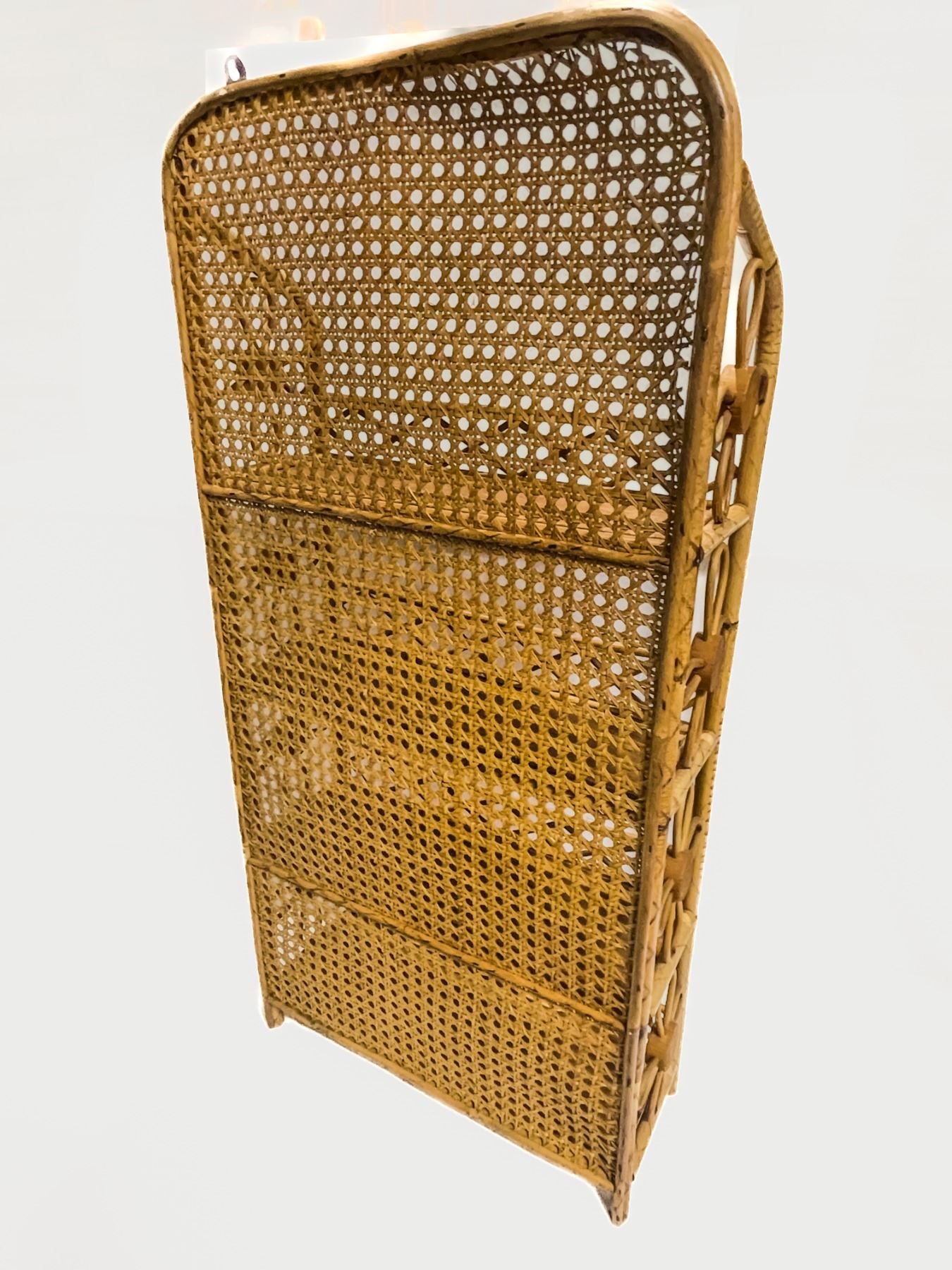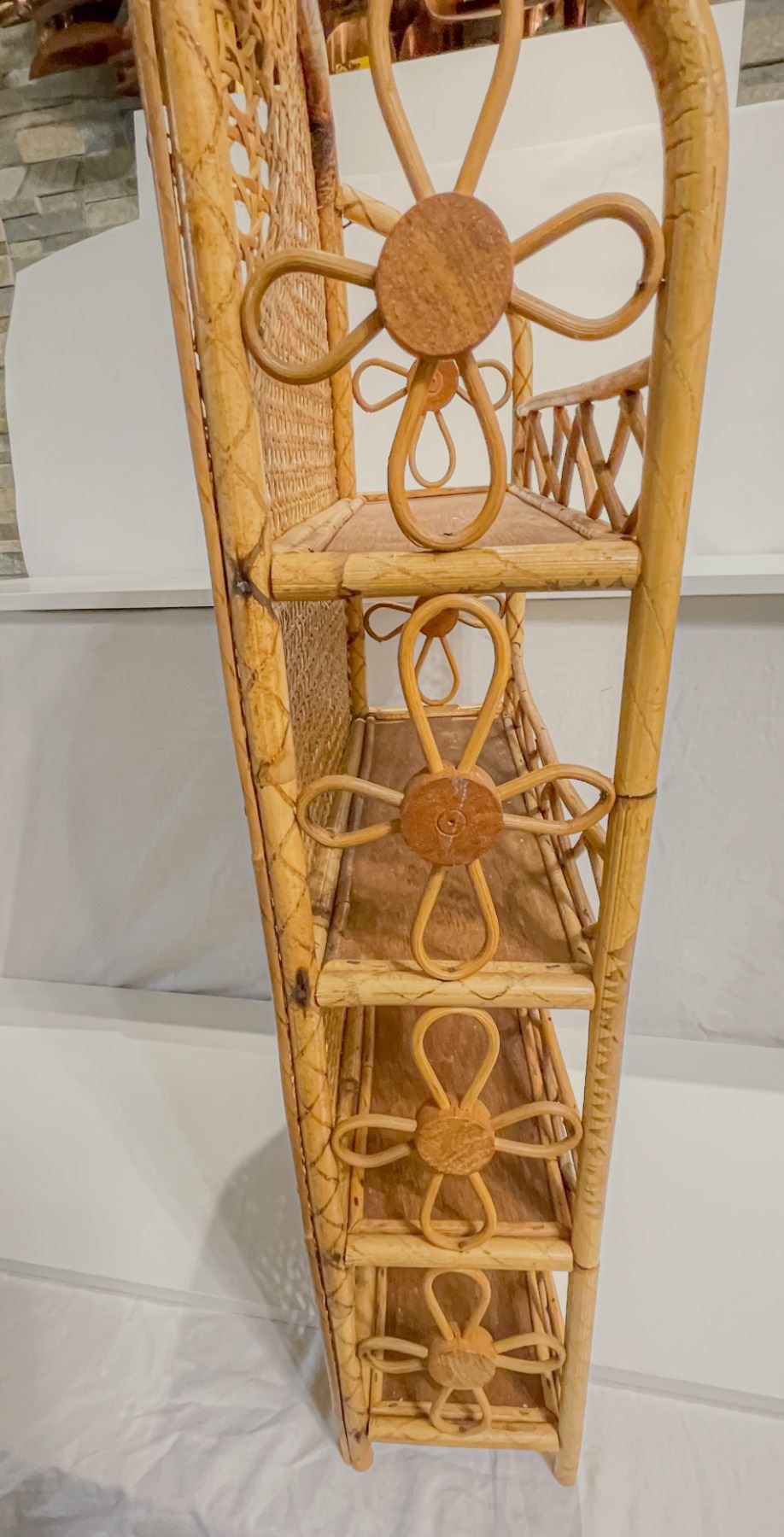 Beautiful vintage rattan and cane shelving unit with floral side details and curved top. Sturdy and in good overall condition — back caning has come loose in one section and needs reattaching. Suitable for tabletop or wall hanging (hardware included). Lovely boho-style accent for plants, towels, or display pieces.