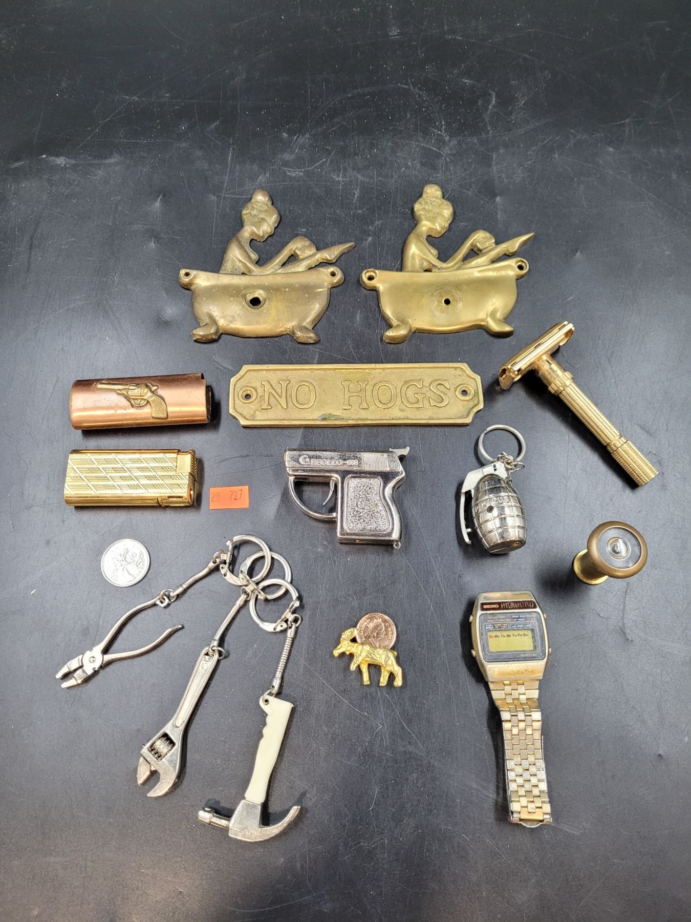 Vintage Razor, Brass Signs, Lighter Covers, Tool Keychains, & Smalls
