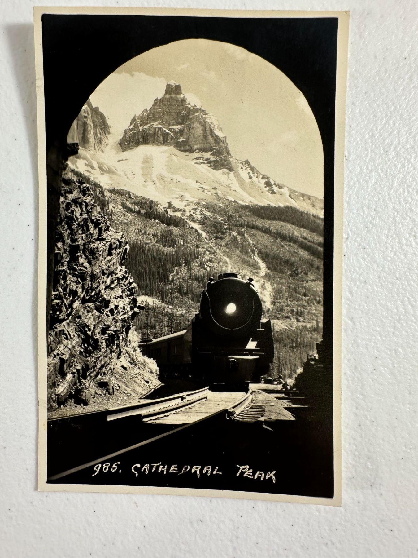 RPPC titled 985. Cathedral Peak with steam locomotive from tunnel and mountain backdrop. Condition: Excellent; minimal wear.