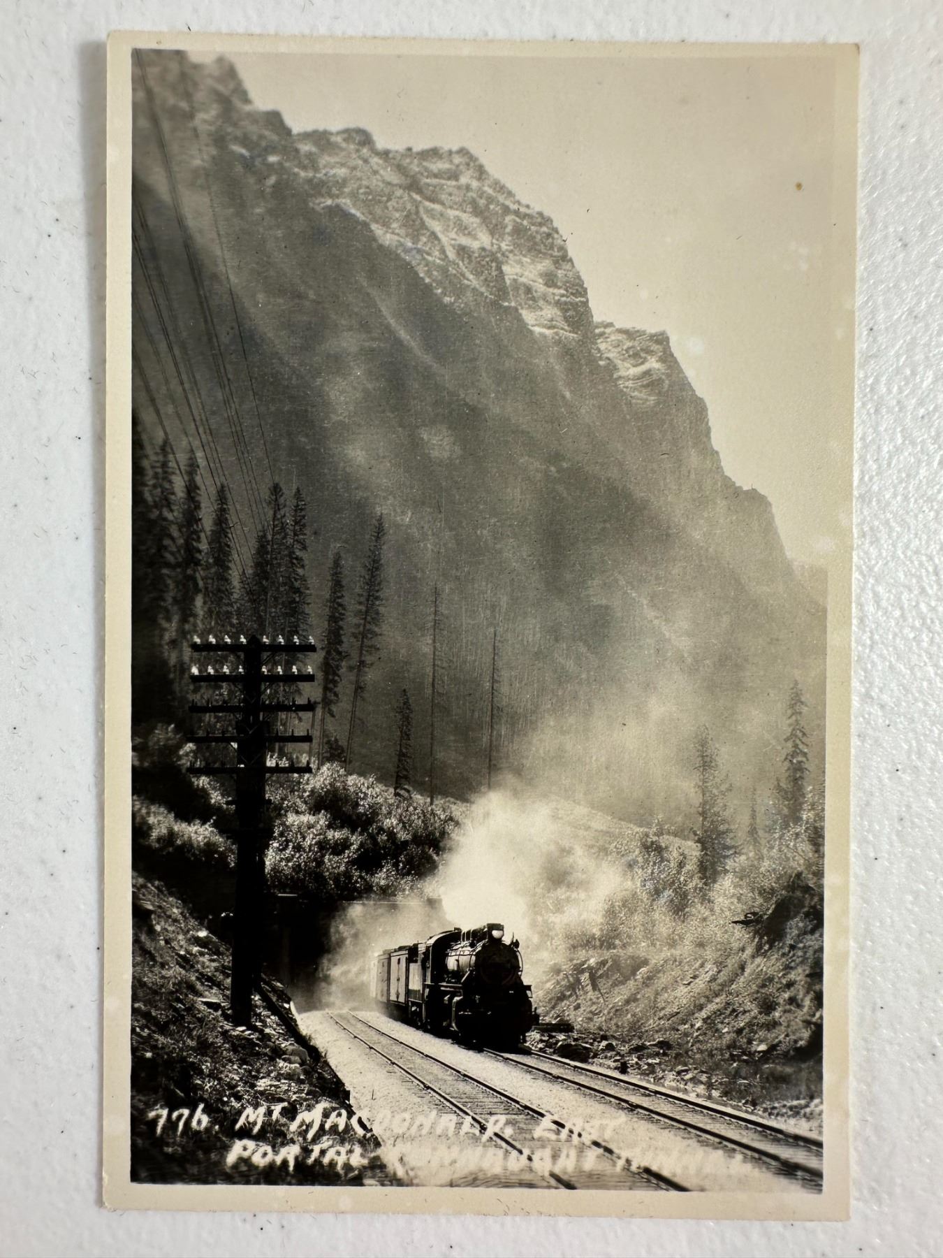 RPPC titled 776. Mt. Macdonald Tunnel Portal showing steam locomotive emerging beneath towering slopes. Condition: Excellent; light handling wear.