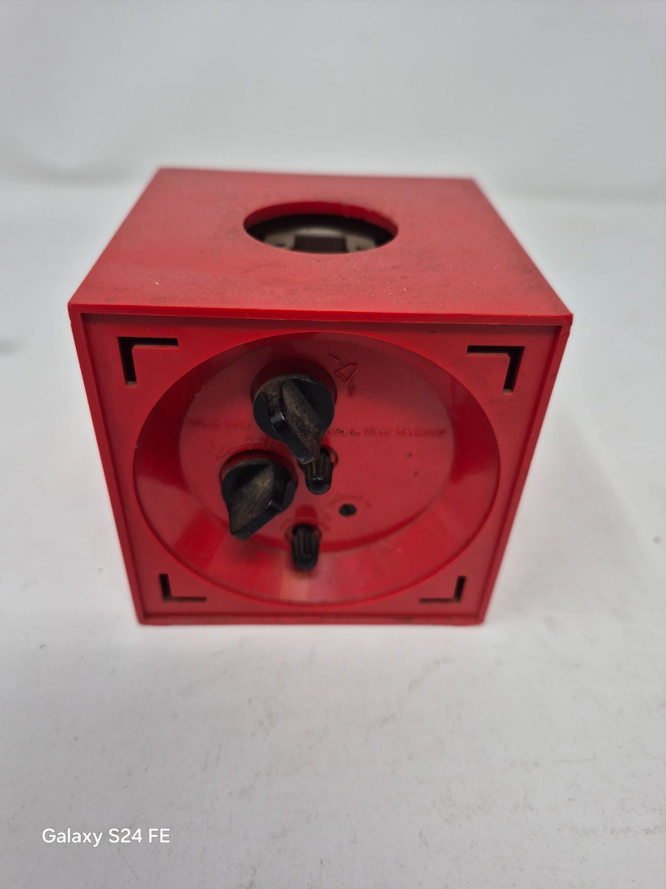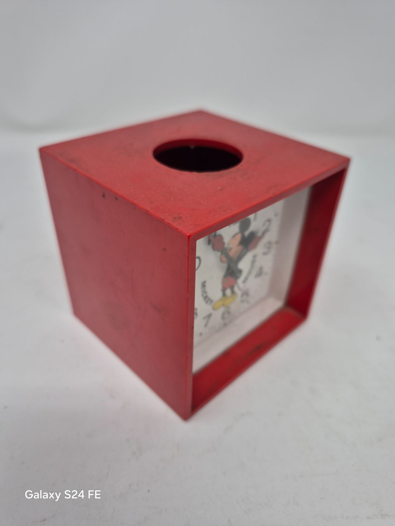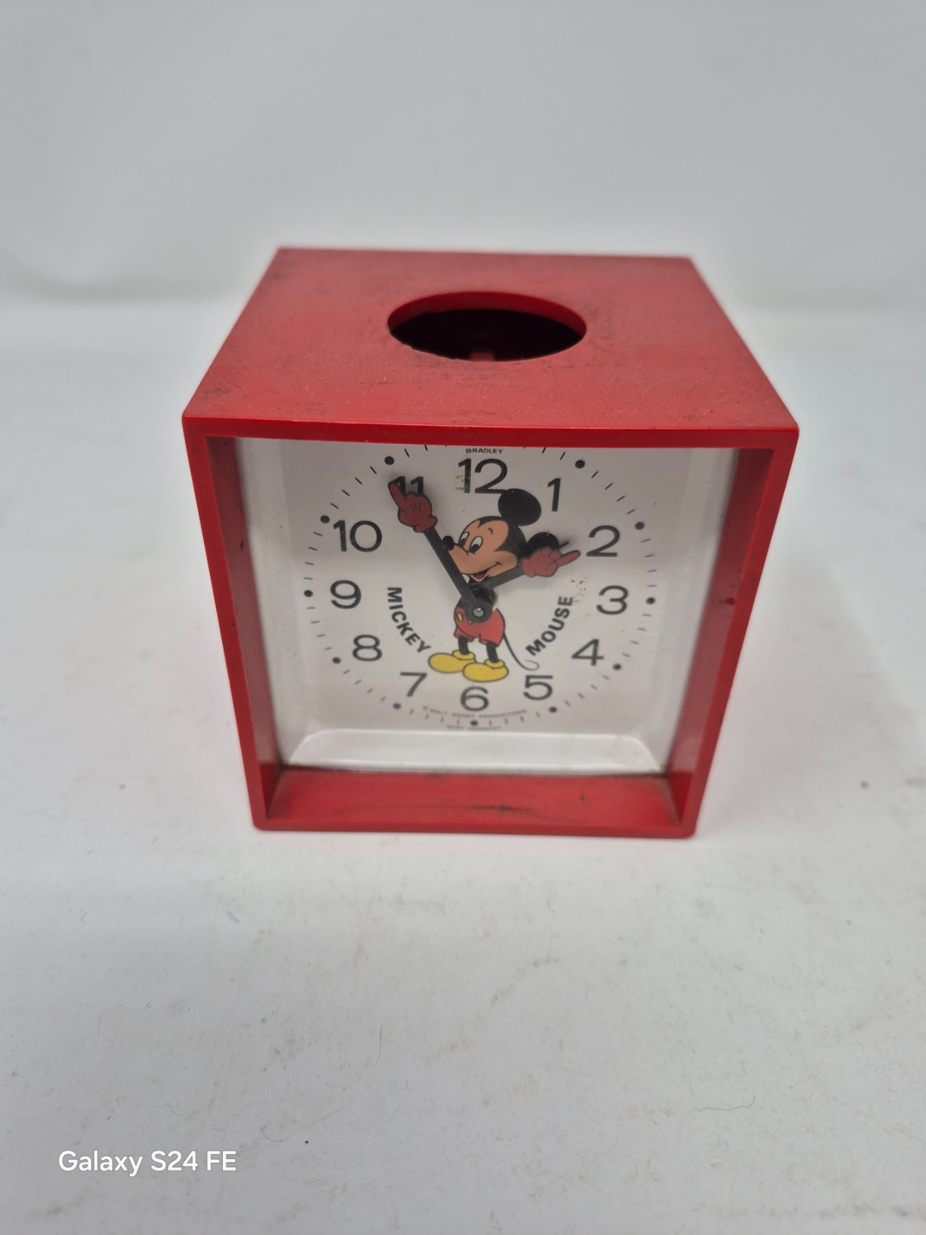 Cube-shaped wind-up clock featuring Mickey Mouse graphic, marked Bradley.