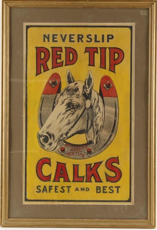 "Never Slip Red Tip Calks, Safest and Best". Framed and matted 19-1/2" wide x 28-3/4" high.