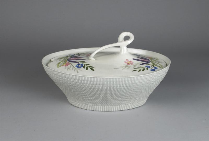 Burlaped style pattern with floral and leaf designs in purple, pink, blue, yellow and green and with curved and twisted handle. 14" L, chip to outer edge of tureen with smaller flea chips, and no ladle. Private collection Metamora, Michigan.