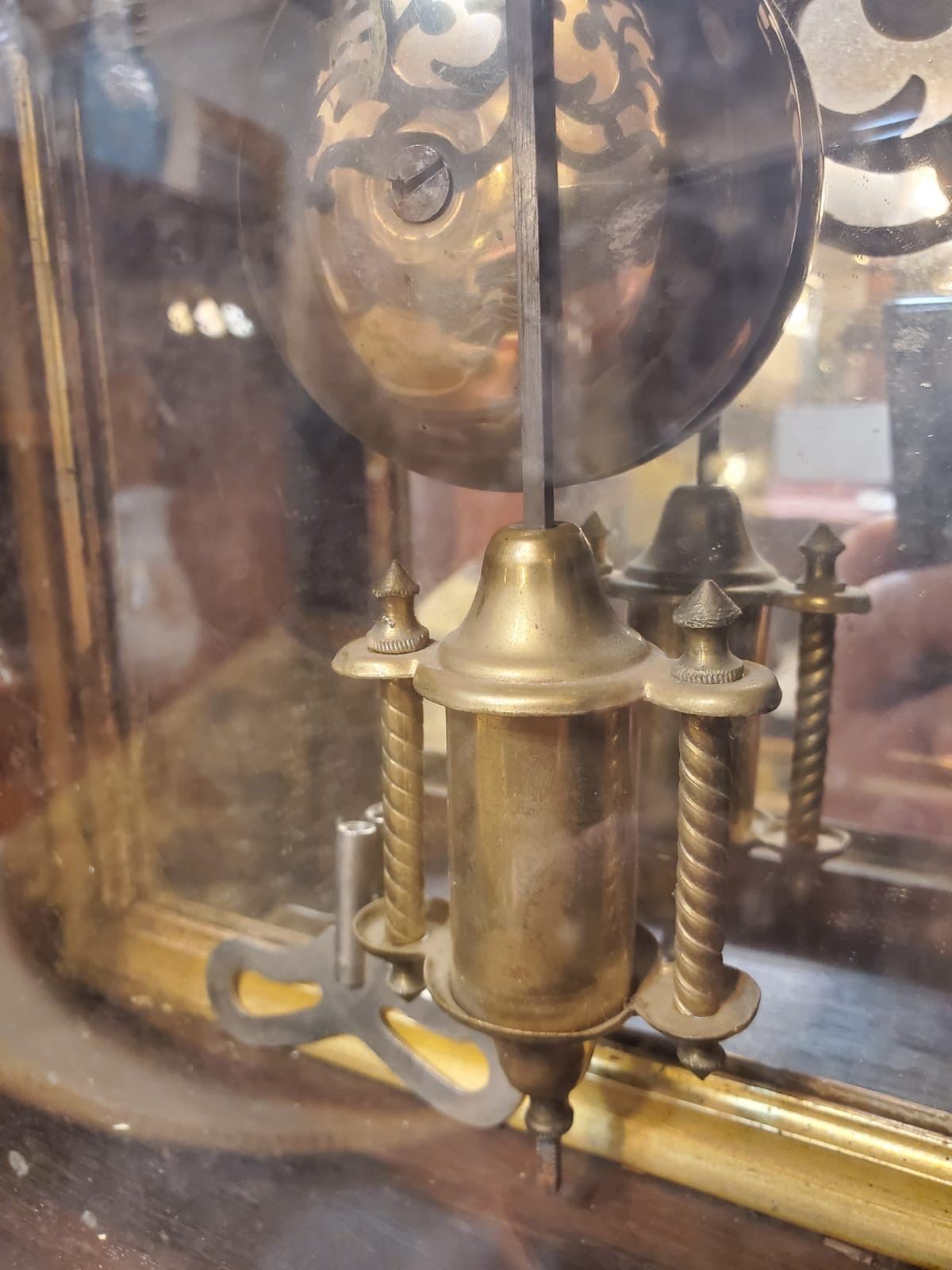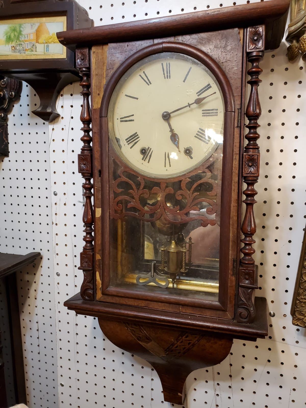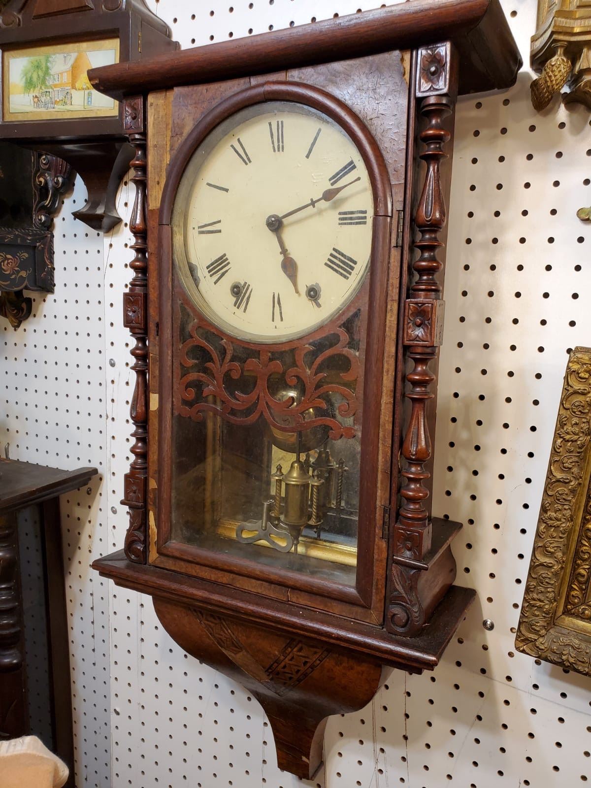 Regulator wall clock, with fully carved columns, pendulum and key wind.