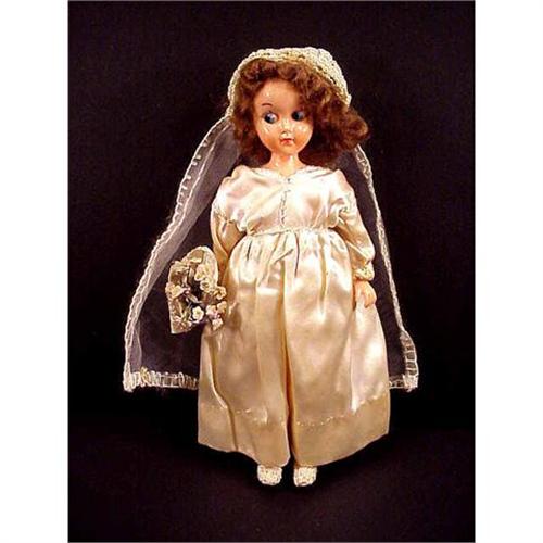 Wonderful & ever so sweet is this RELIABLE made hard plastic doll. This is a BRIDE doll completely dressed in her satin gown, slip, silk panties & shoes, veil and crown and still holding the bouquet of flowers. Her mohair hair is in very nice condition. Her blue eyes are googoly like and are sleep eyes. She is in wonderful condition, just needs to be restrung, alas the arms & head are loose, but easily fixed with restringing, otherwise just great! She stands about 11 ½ inches high. What a beautiful doll to display & proudly add to one?s collection of dolls.