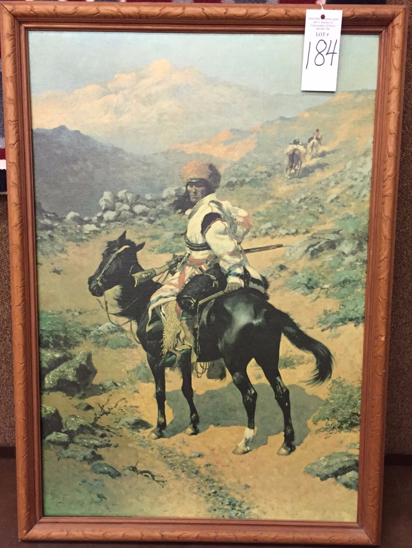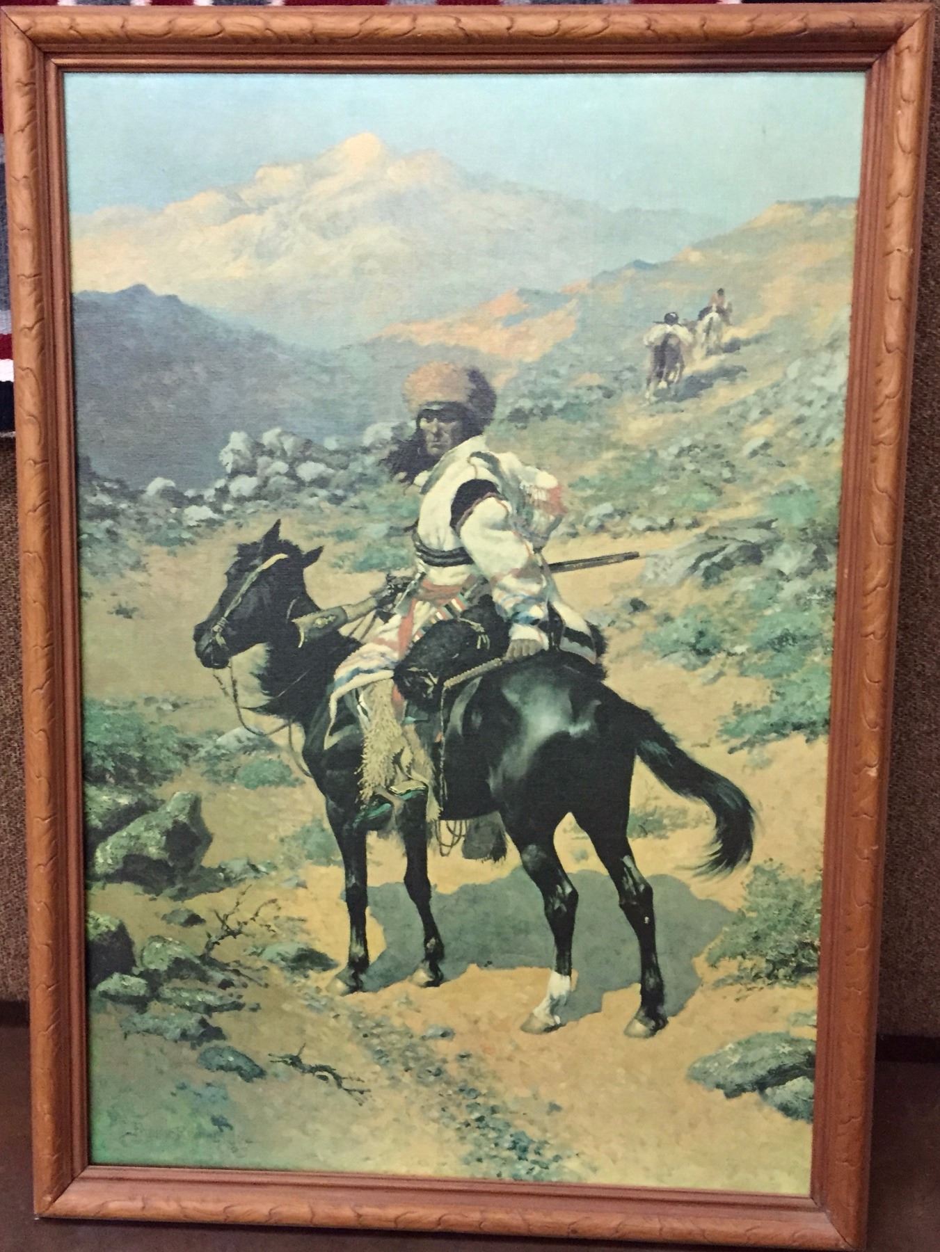 Maker: Original was by Frederick Remington (1861-1909). Approx. Age: Vintage. Size: 23” X 33” with frame. Additional Info: A vintage canvas transfer print of, An Indian Trapper. Condition: Pretty good for its age, normal wear expected and it’s loose in the frame. Please look closely at the pictures - they are an important part of our description. Shipping: There will be a $10 handling / packaging fee for shipping this lot. The actual cost of postage will be added on top of that.