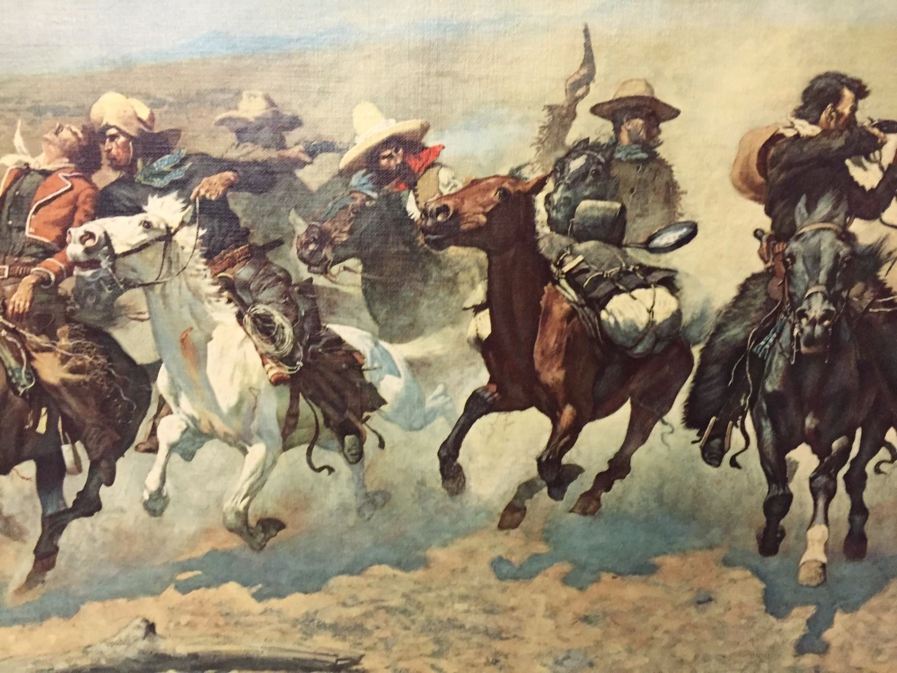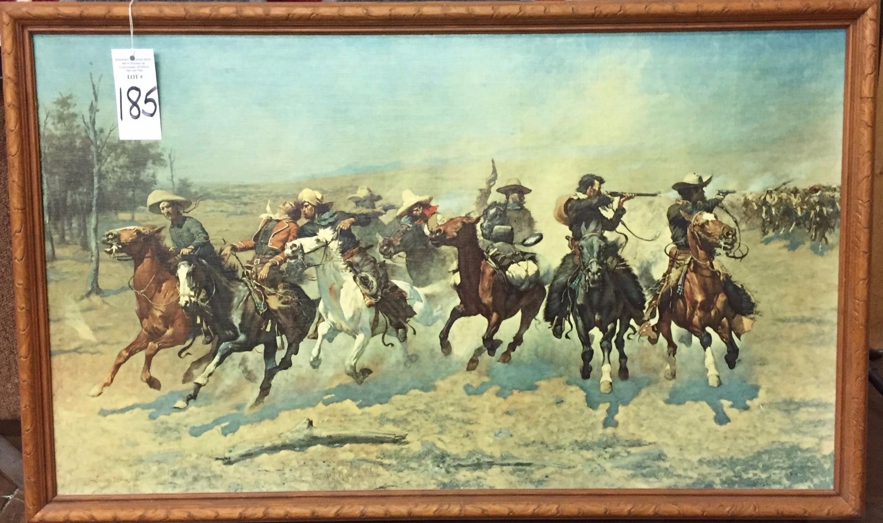 Maker: Original was by Frederick Remington (1861-1909). Approx. Age: Vintage. Size: 41” X 25.5” with frame. Additional Info: A vintage canvas transfer print of, A Dash For Timber. Condition: Good for its age, normal wear expected. Please look closely at the pictures - they are an important part of our description. Shipping: There will be a $10 handling / packaging fee for shipping this lot. The actual cost of postage will be added on top of that.