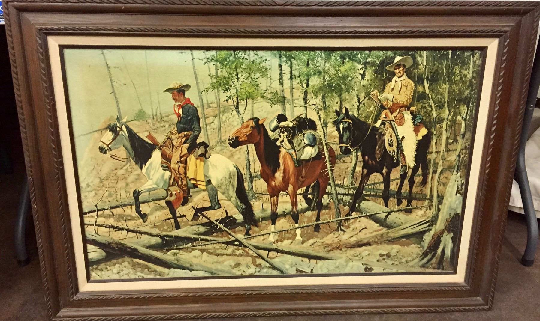 Maker: Original was by Frederick Remington (1861-1909). Approx. Age: Vintage. Size: 43” X 29” with frame. Additional Info: A vintage canvas transfer print of, Prospecting for Cattle Range. Condition: Good for its age, normal wear expected. Please look closely at the pictures - they are an important part of our description. Shipping: There will be a $10 handling / packaging fee for shipping this lot. The actual cost of postage will be added on top of that.