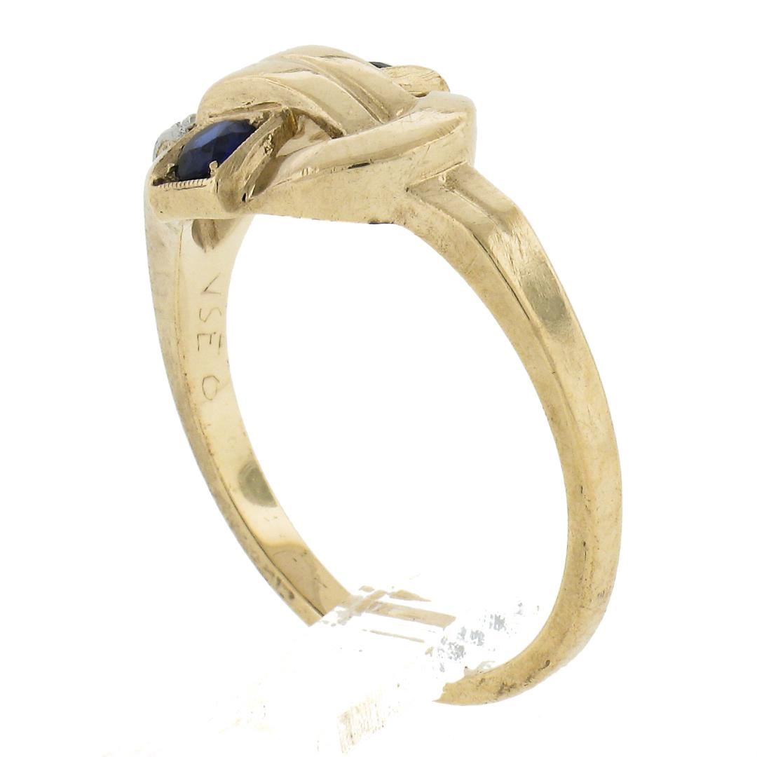 A vintage solid 10k yellow gold & palladium ring, with 2 round cut synthetic sapphire, and 1 old single cut natural diamond (G- VS2; 0.03ct ). The ring is size 7.0, weighs a total of 2.41 grams, and measures 10.1mm wide.