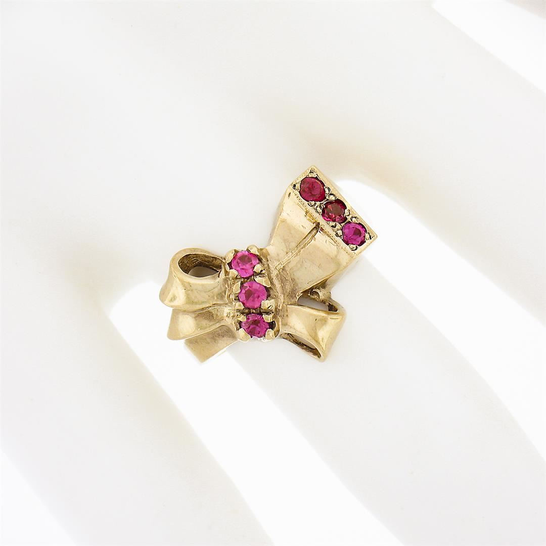A vintage solid 10k yellow gold bow ring, with 6 round cut red stones (2.25mm each). The ring is size 5.5, weighs a total of 3.19 grams, and measures 14.40mm wide.