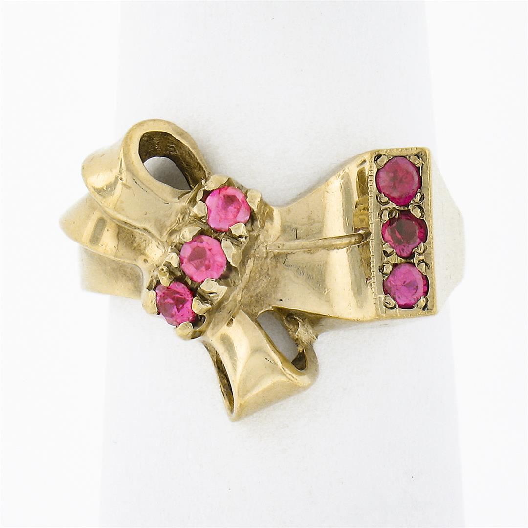A vintage solid 10k yellow gold bow ring, with 6 round cut red stones (2.25mm each). The ring is size 5.5, weighs a total of 3.19 grams, and measures 14.40mm wide.