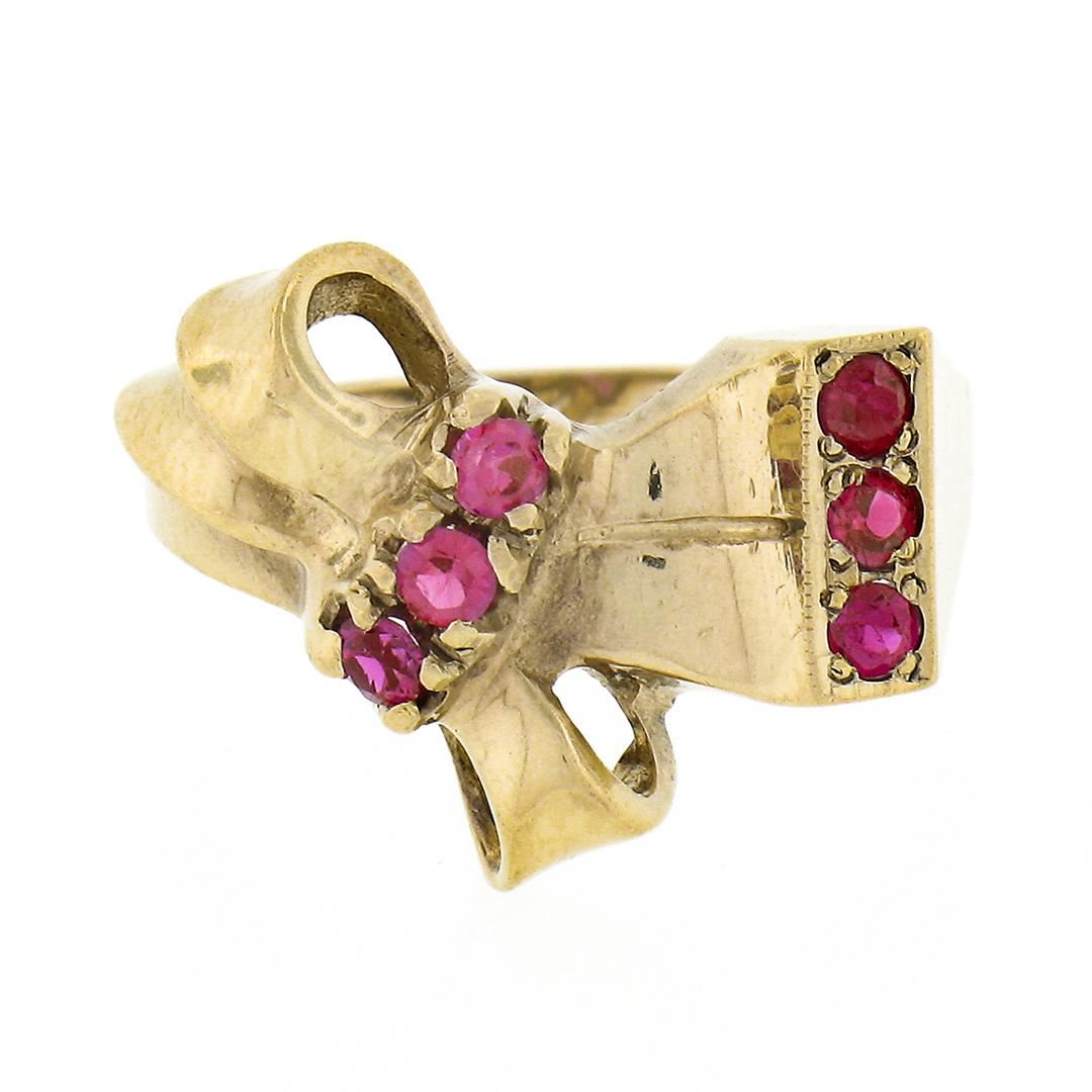 Vintage Retro 10k Yellow Gold Round Brilliant Red Stone Polished Bow Ribbon Ring