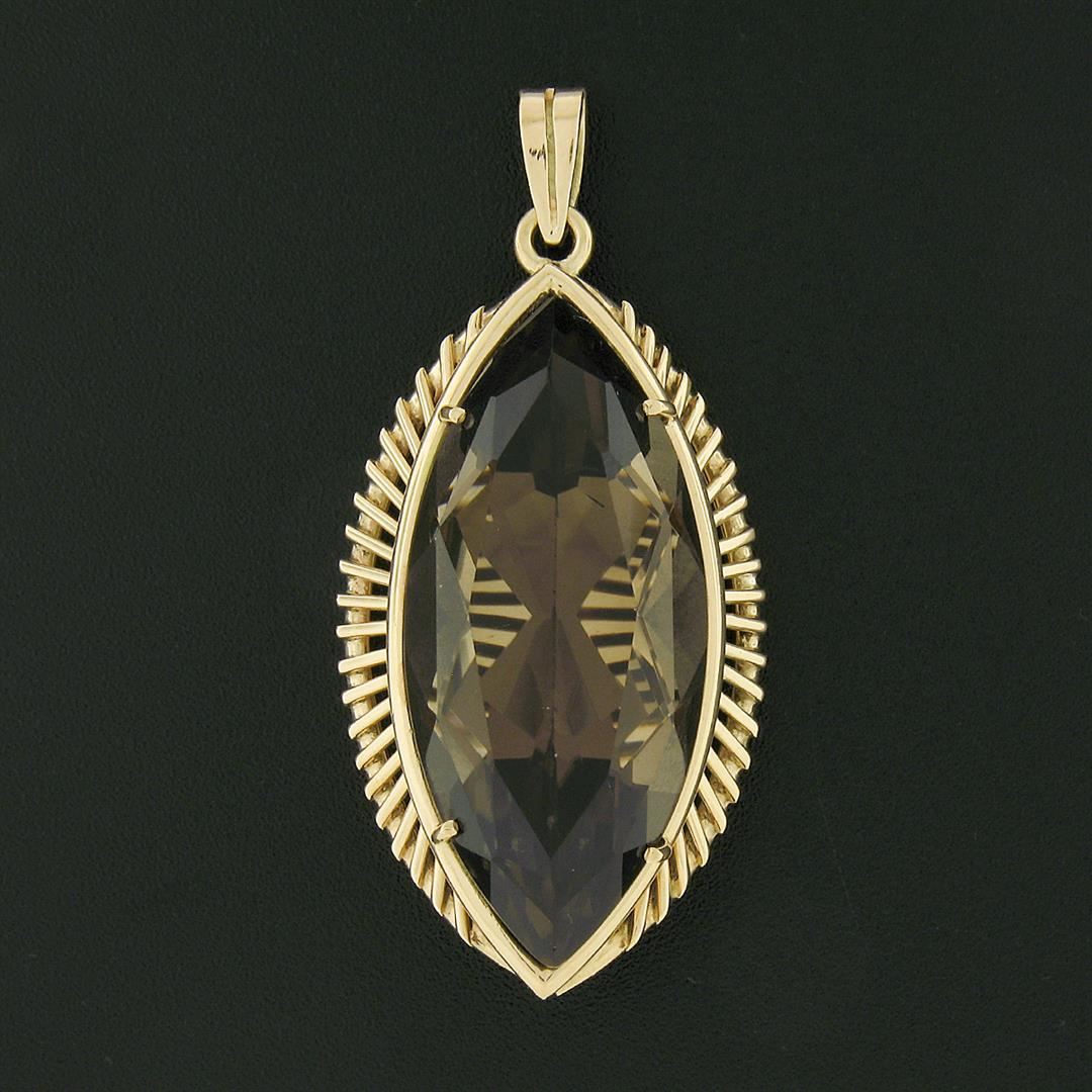 A solid 14k rosy yellow gold handmade open wire large pendant, with 1 marquise cut natural smoky quartz (37.85x17.0mm). The pendant weighs a total of 17.27 grams, measures 52.20x24.70mm including the bail, and the inside of the bail measures 6x3.9mm.