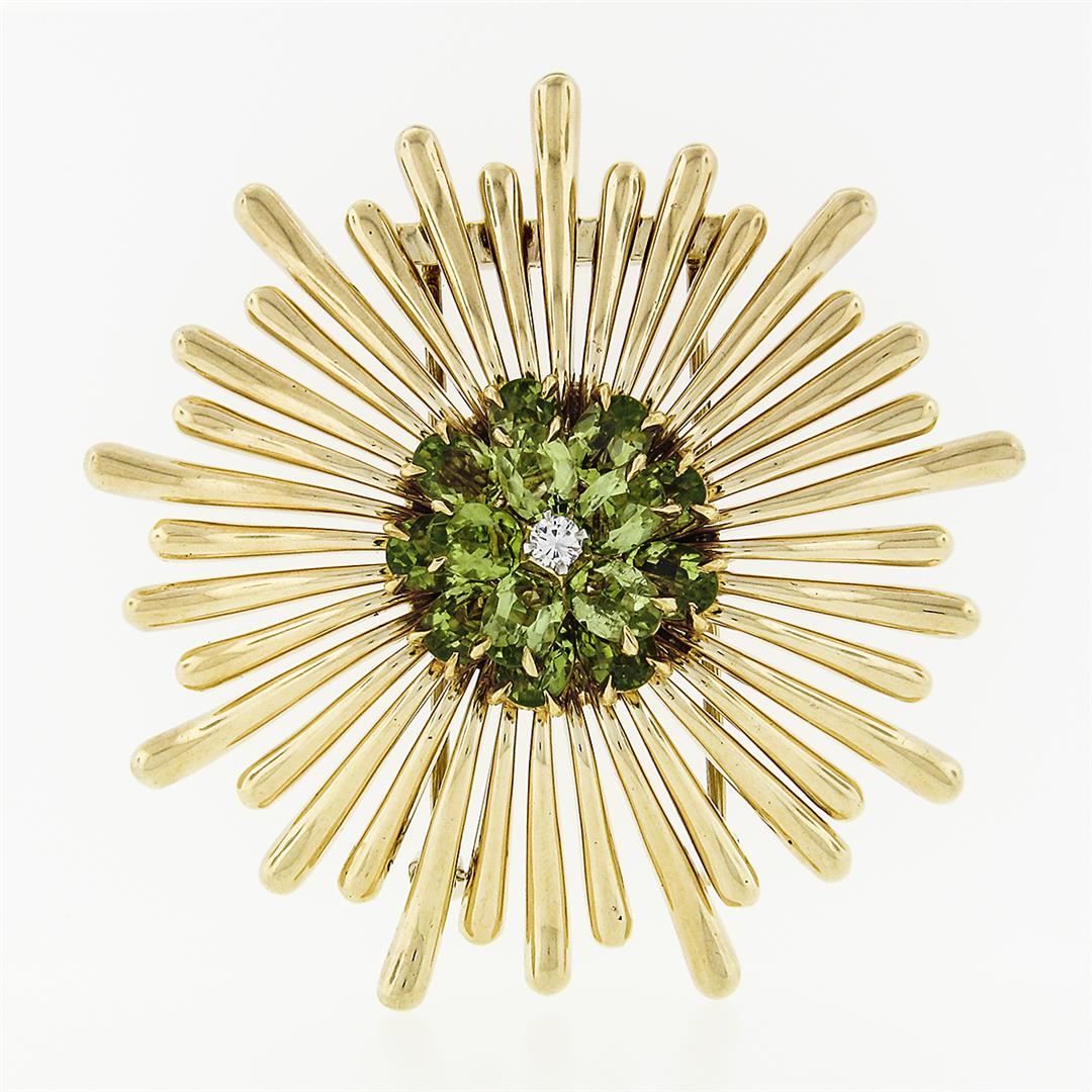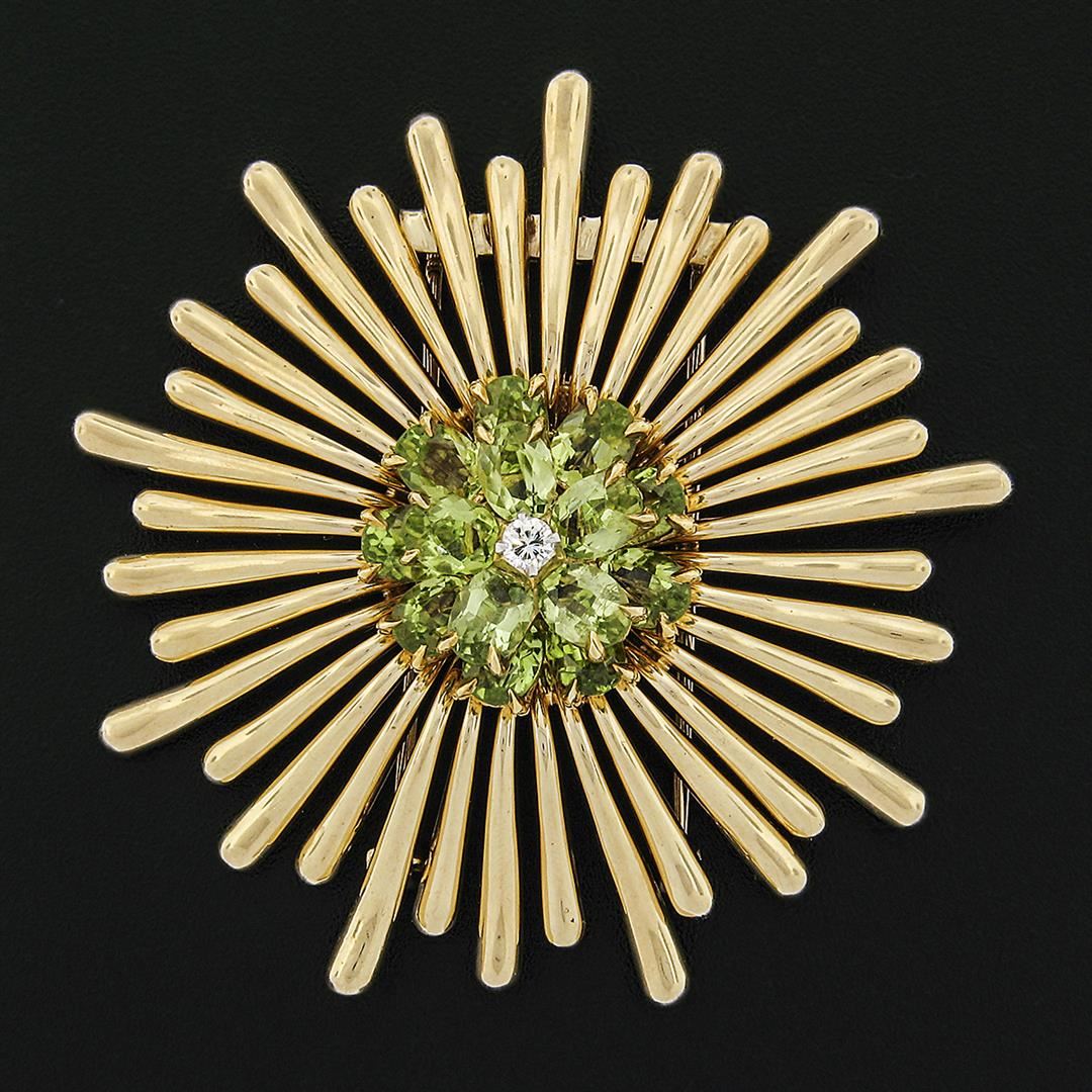 A vintage solid 14k yellow gold pin brooch, with 14 oval brilliant cut natural peridot (9.50ctw ), and 1 round brilliant cut natural diamond (F - VS1 ; 0.13ct). Measures 58.3mm in diameter and weighs a total of 39.32 grams.