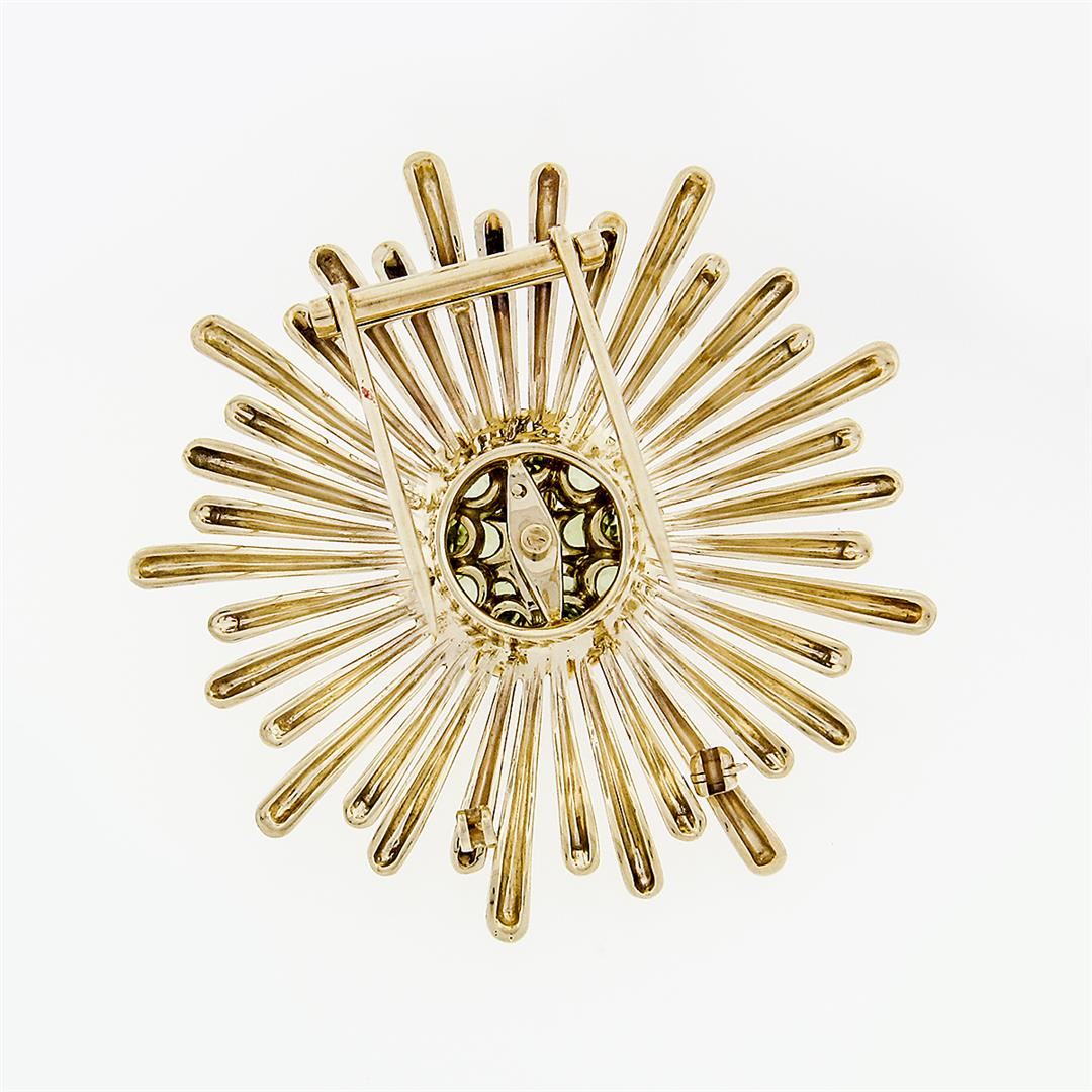 A vintage solid 14k yellow gold pin brooch, with 14 oval brilliant cut natural peridot (9.50ctw ), and 1 round brilliant cut natural diamond (F - VS1 ; 0.13ct). Measures 58.3mm in diameter and weighs a total of 39.32 grams.