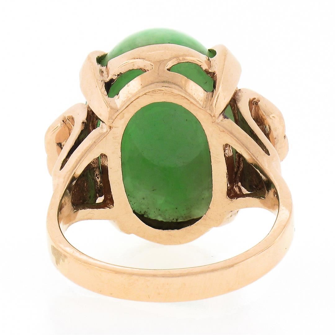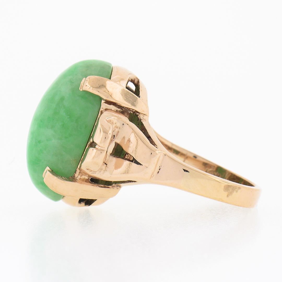 A vintage solid 14k yellow gold ring, with 1 oval cabochon cut natural mebled jade (17.9x13mm). The ring is size 6.0, weighs a total of 8.59 grams, and measures 17.9mm wide.
