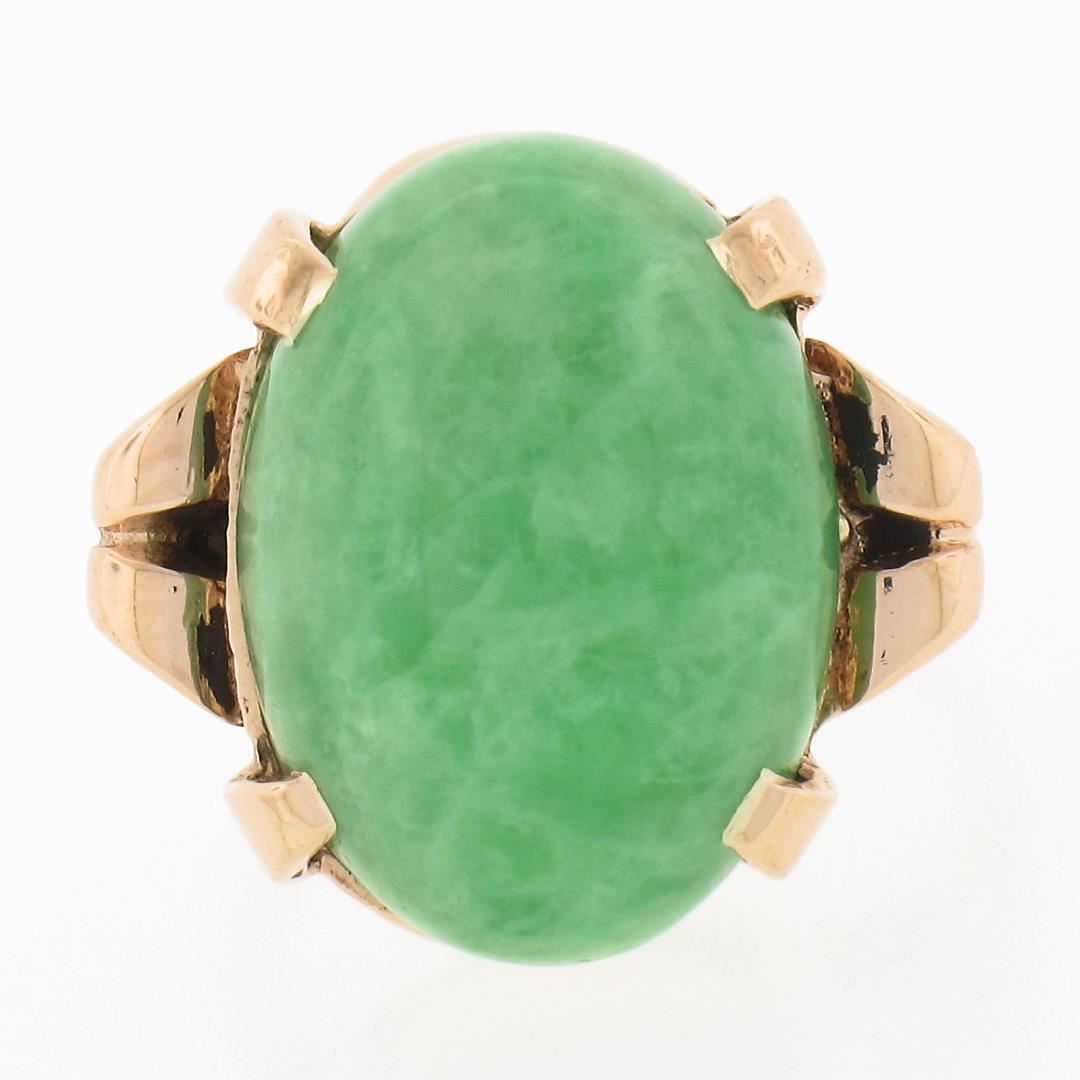 A vintage solid 14k yellow gold ring, with 1 oval cabochon cut natural mebled jade (17.9x13mm). The ring is size 6.0, weighs a total of 8.59 grams, and measures 17.9mm wide.