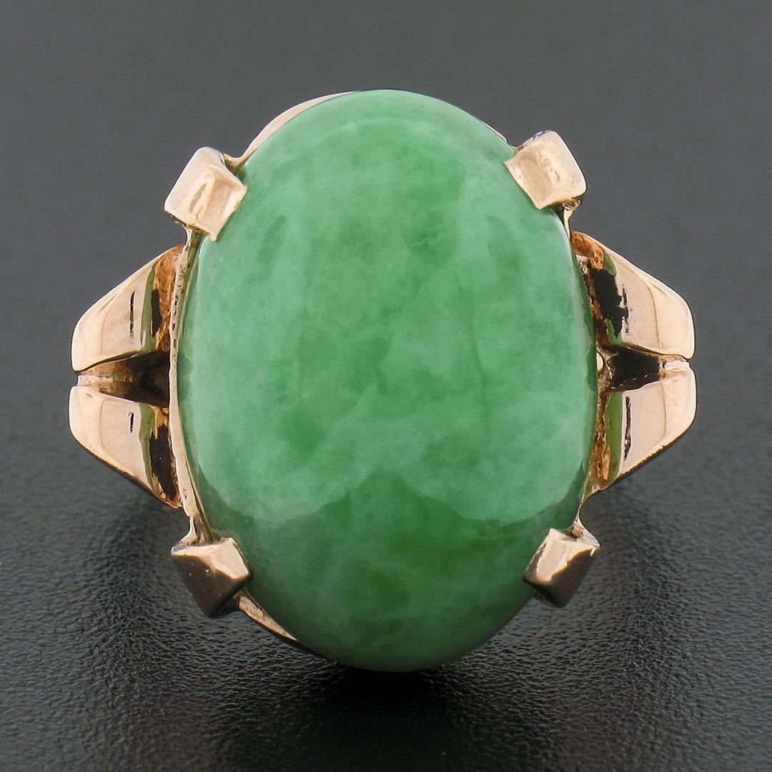 Vintage Retro 14K Rose Gold Oval Cabochon Marbled Jade Solitaire Cocktail Ring