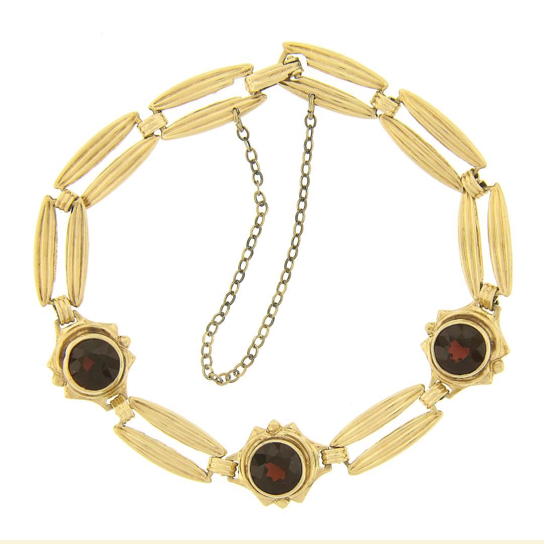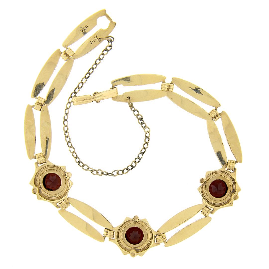 A vintage 14k yellow gold link bracelet, with 3 old round cut natural garnets (7mm - 4.8ctw). It weighs a total of 10.45 grams, measures 11.9mm wide, and measures 6.75 inches in length.