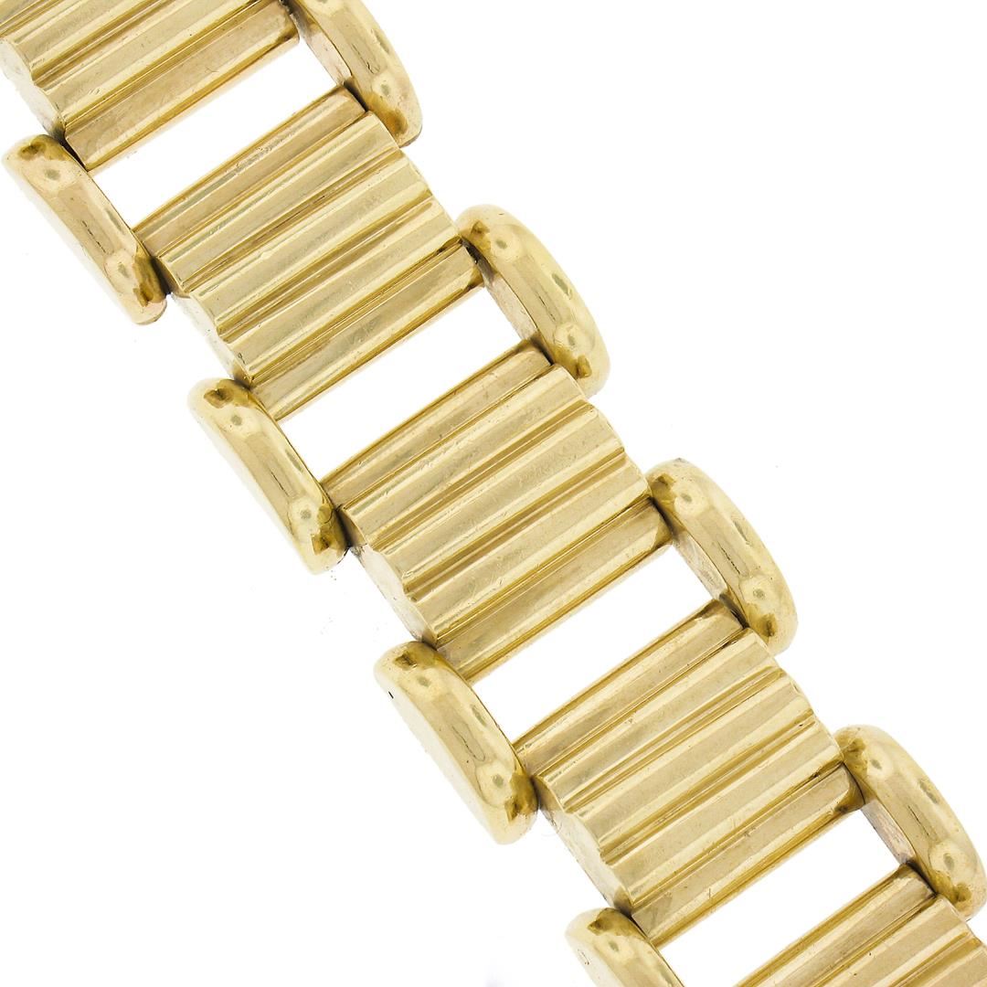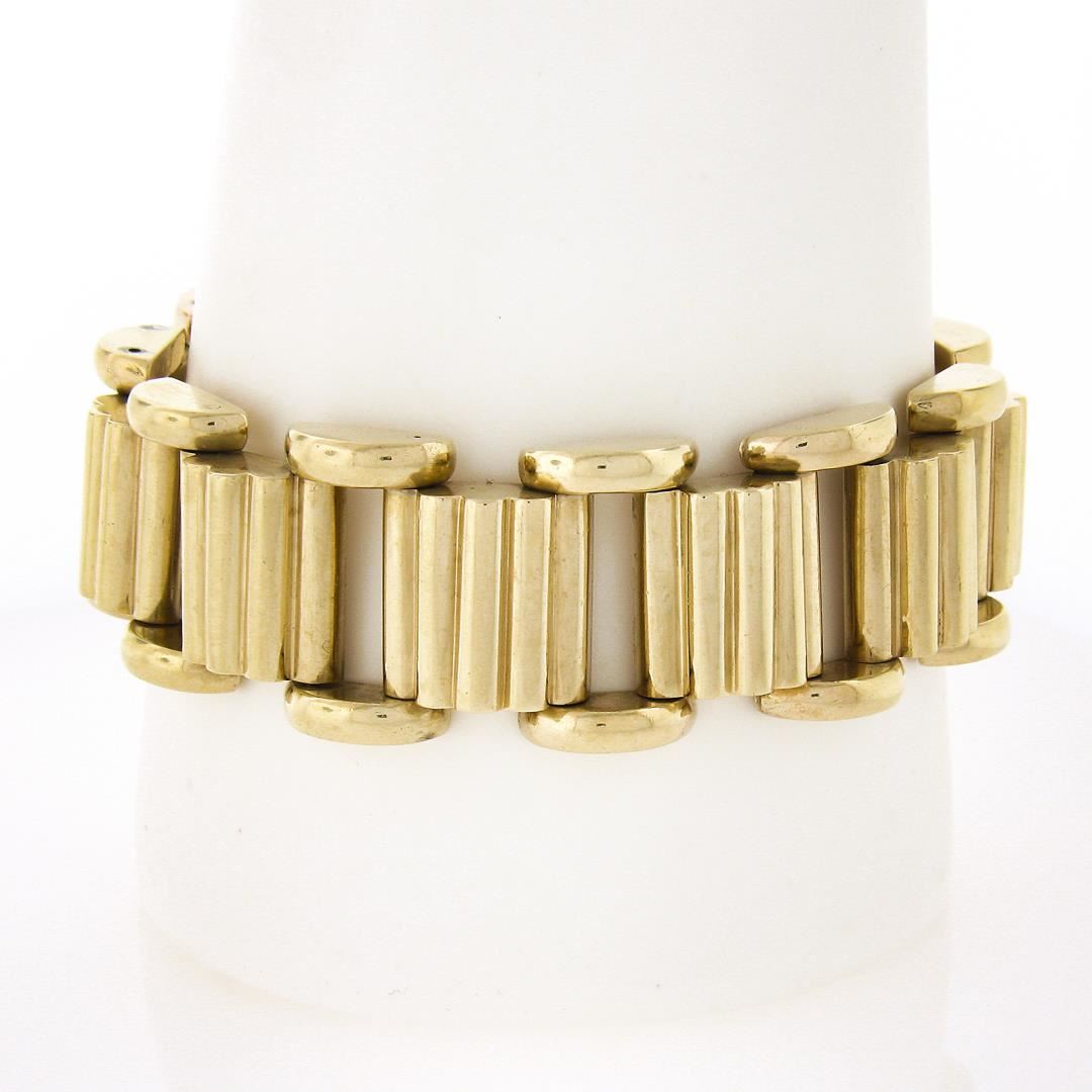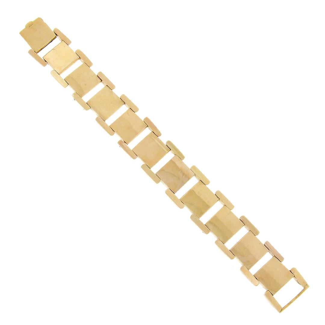 A vintage retro solid 14k yellow gold wide link bracelet. It weighs a total of 88.44 grams, measures 20mm wide, and measures 7.25 inches in length.
