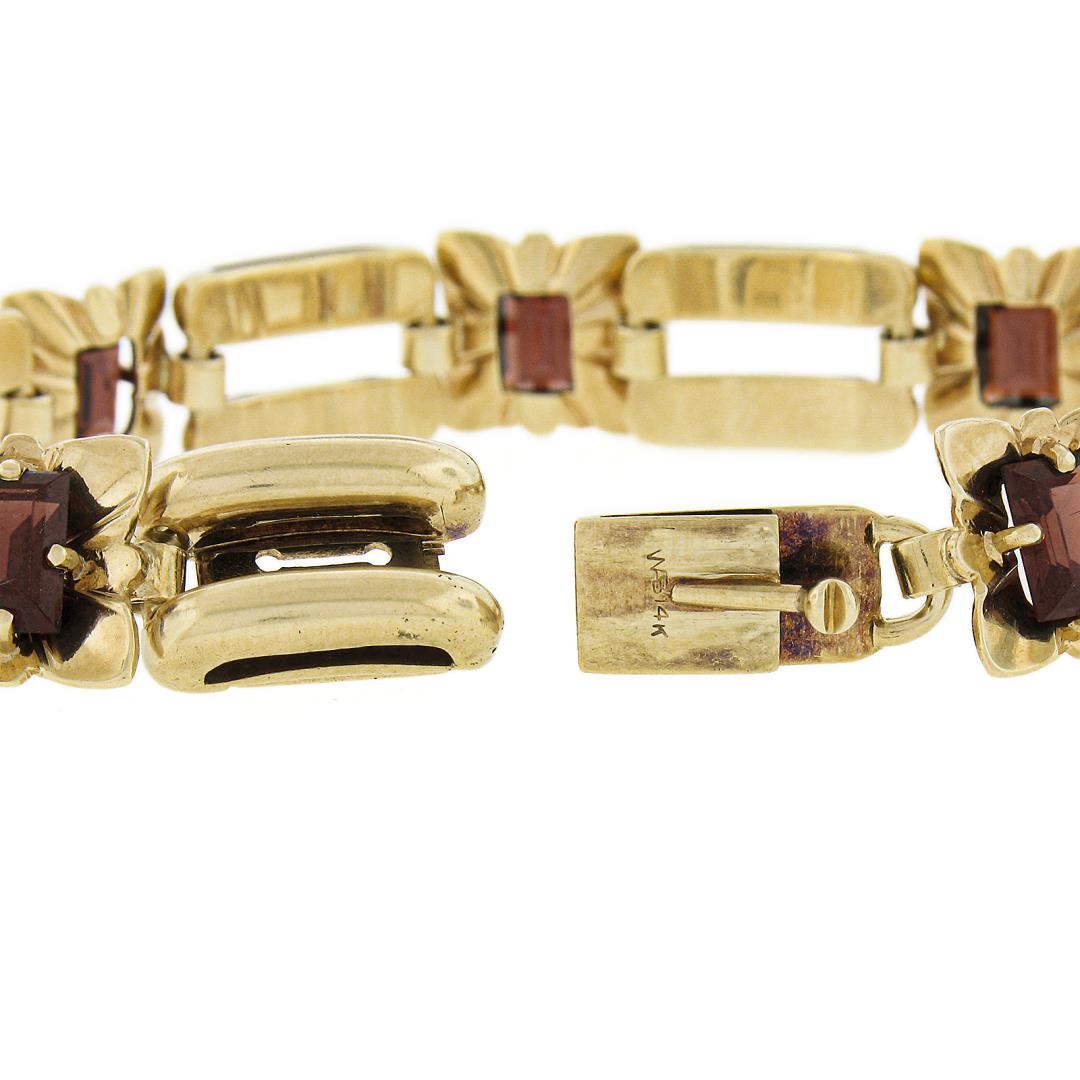 A vintage solid 14k yellow gold tube bracelet, with 7 rectangular cut natural garnets (8-10ctw). It weighs a total of 29.41 grams, measures 11.5mm wide, and measures 7.5 inches in length.