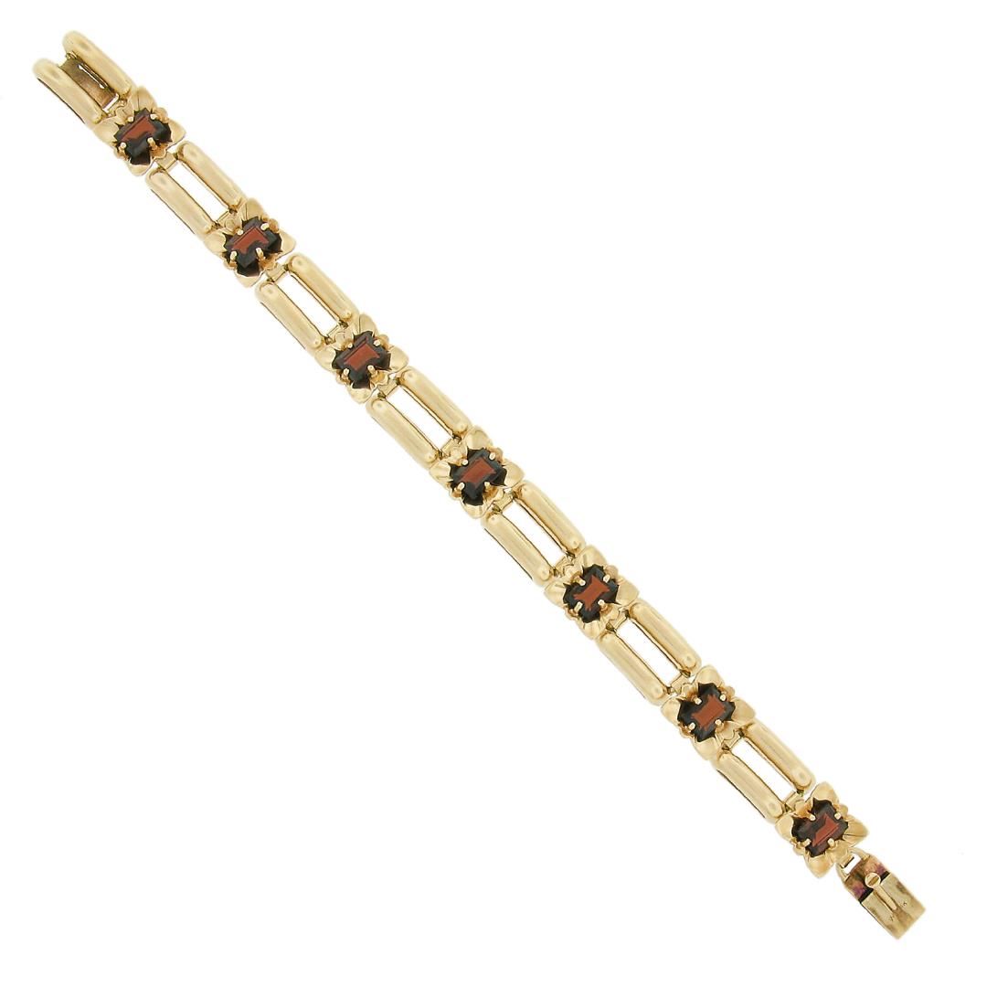 A vintage solid 14k yellow gold tube bracelet, with 7 rectangular cut natural garnets (8-10ctw). It weighs a total of 29.41 grams, measures 11.5mm wide, and measures 7.5 inches in length.