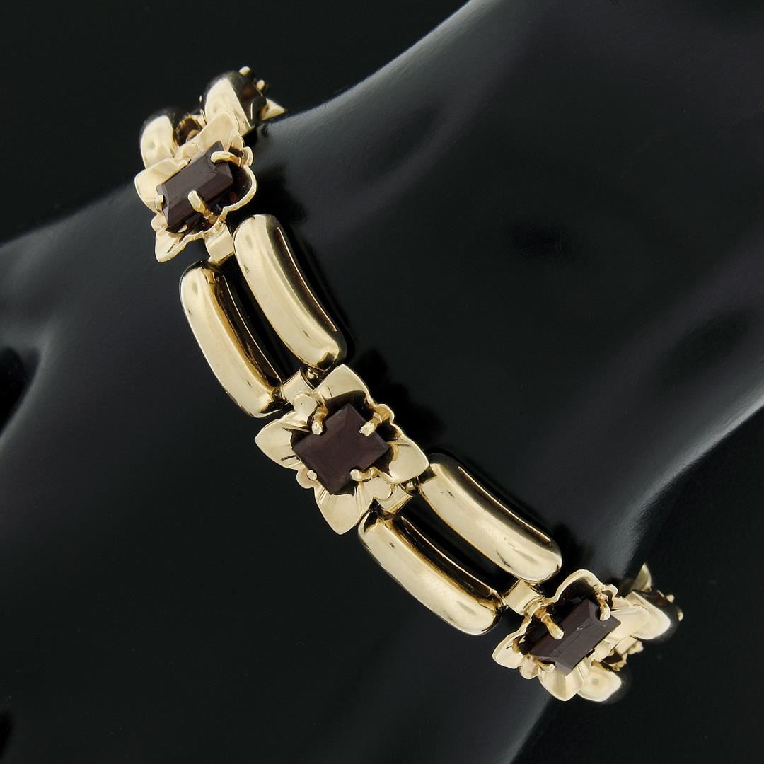 Vintage Retro 14K Yellow Gold 7.5" 10 ctw Garnet Floral Open Tube Link Bracelet