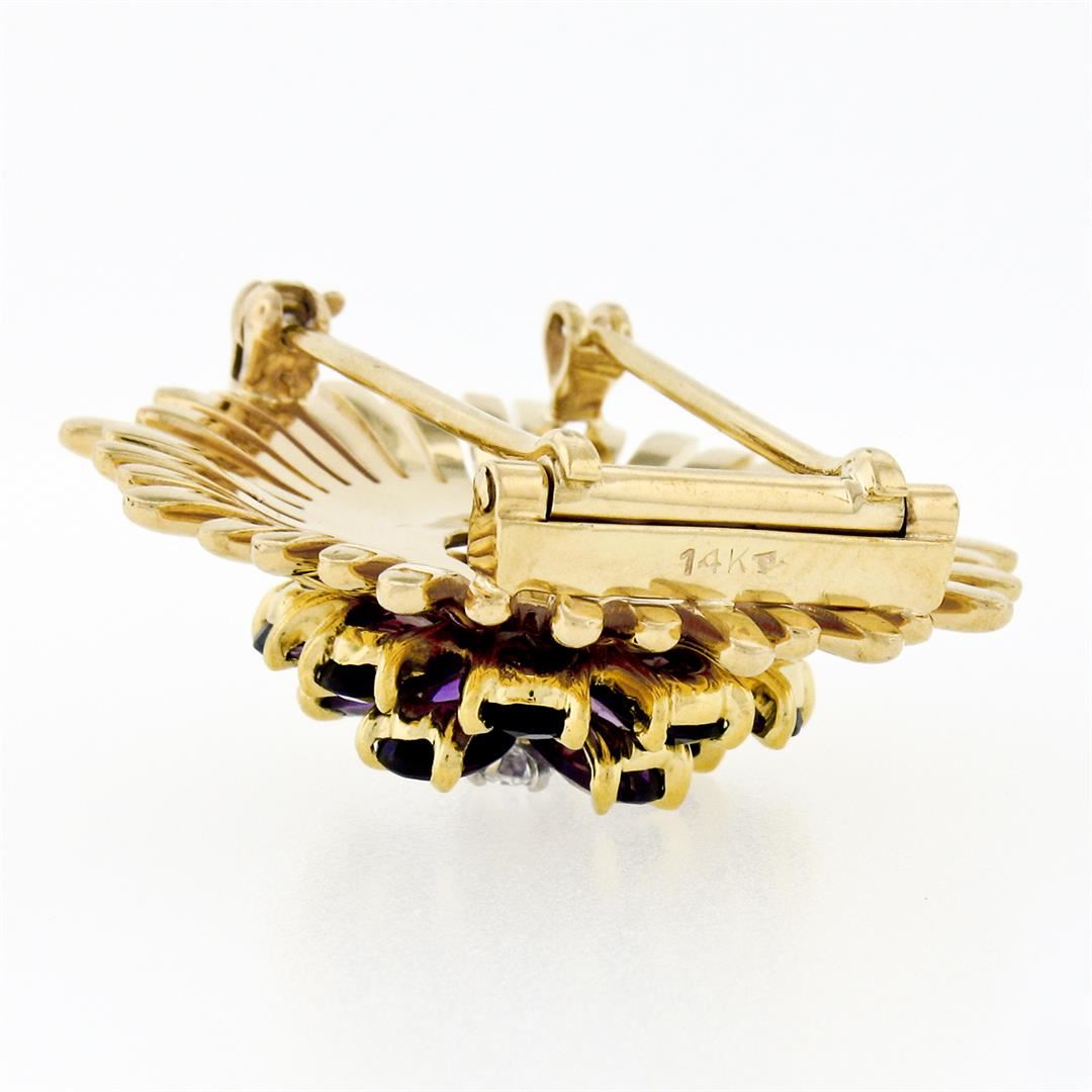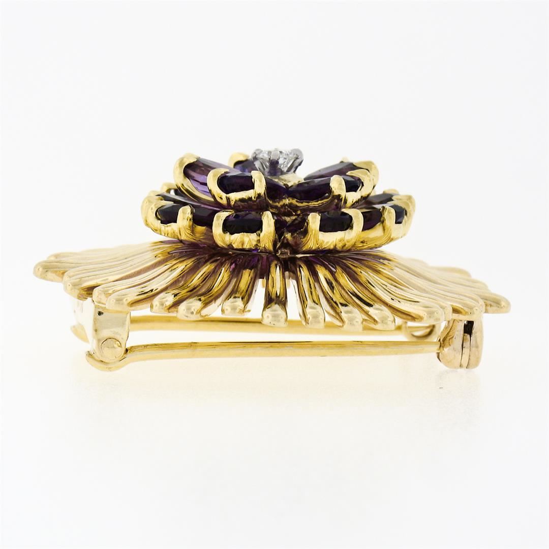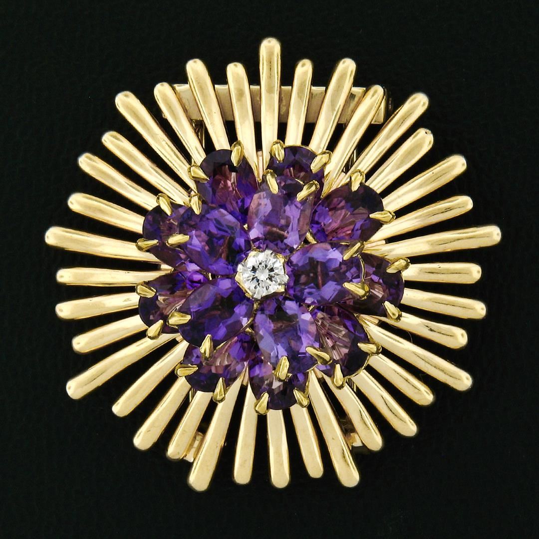 A vintage solid 14k yellow gold burst pin brooch, with 1 round brilliant cut natural diamond (G - VS2 ; 0.11ct), surrounded with 14 oval brilliant cut natural amethysts (6.0x4.5mm - 7.0ctw). Measures 35.1mm in diameter and weighs a total of 19.40 grams.