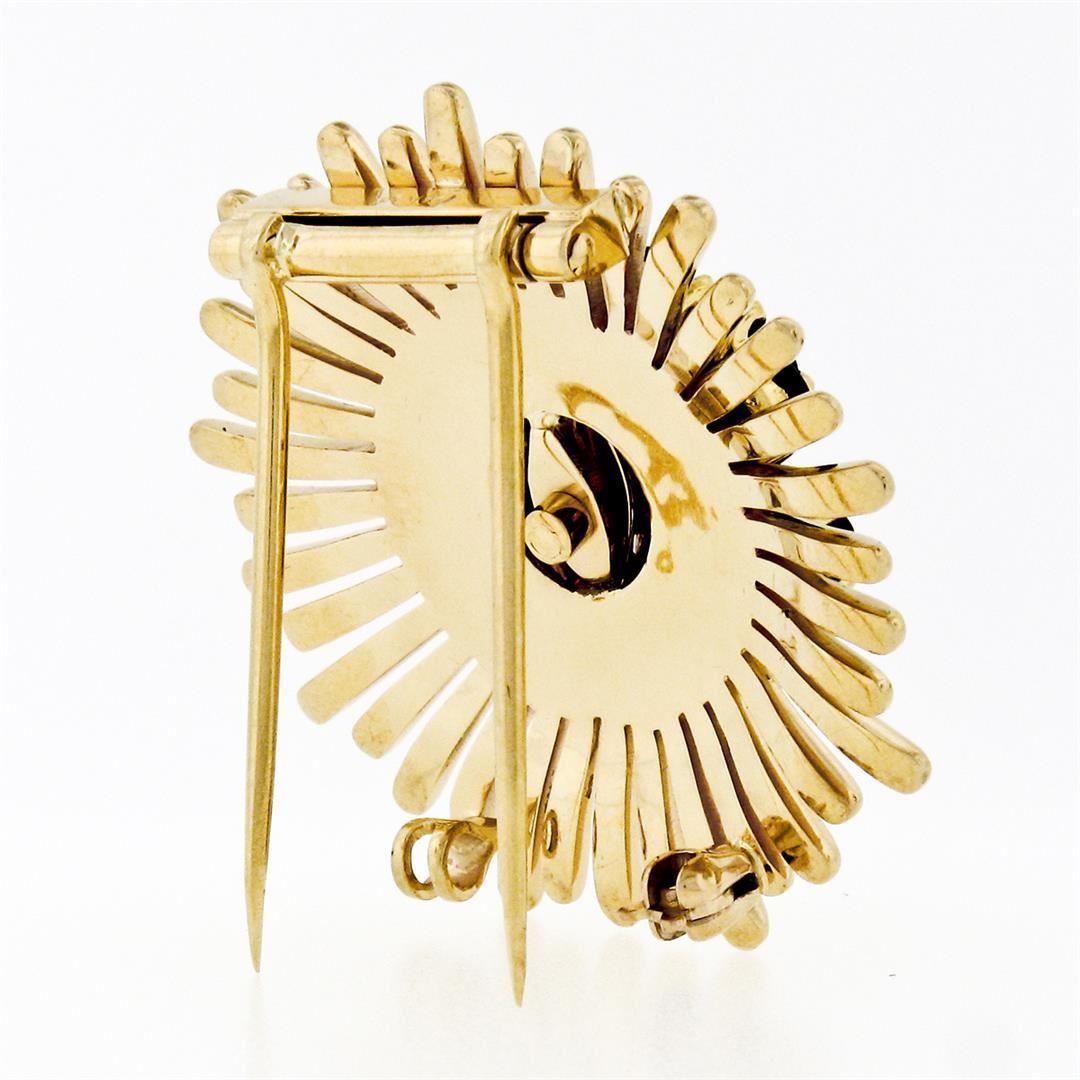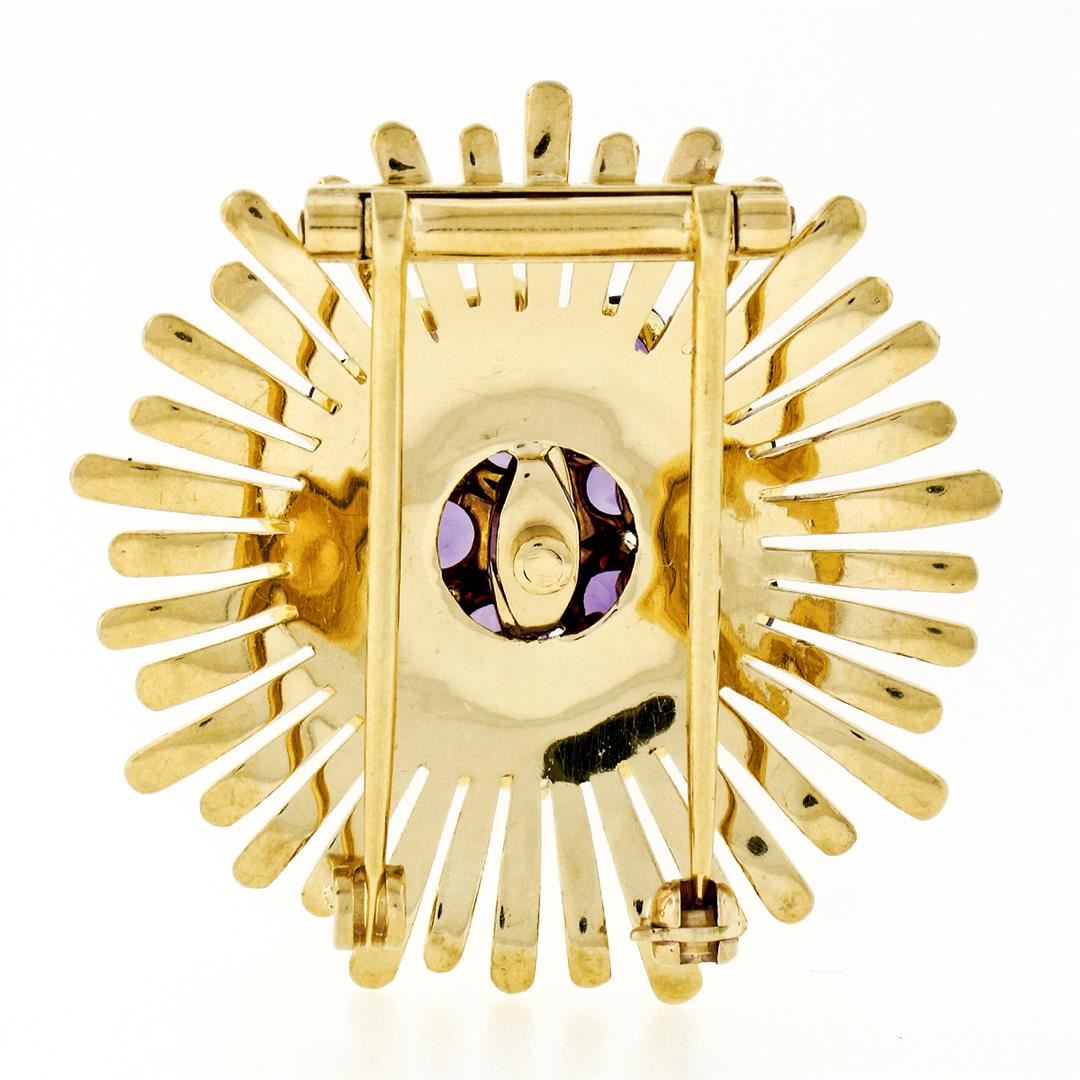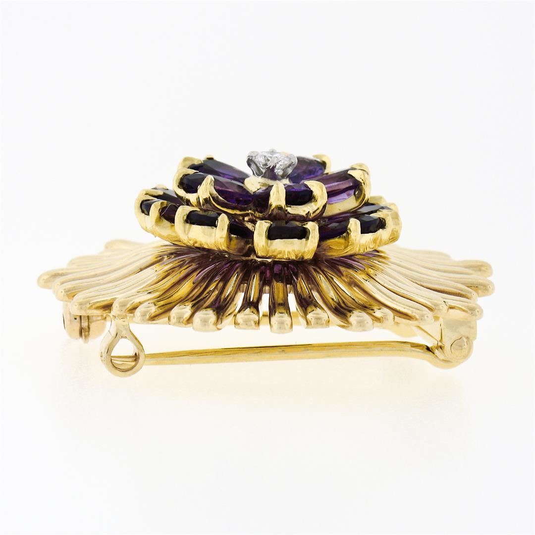A vintage solid 14k yellow gold burst pin brooch, with 1 round brilliant cut natural diamond (G - VS2 ; 0.11ct), surrounded with 14 oval brilliant cut natural amethysts (6.0x4.5mm - 7.0ctw). Measures 35.1mm in diameter and weighs a total of 19.40 grams.