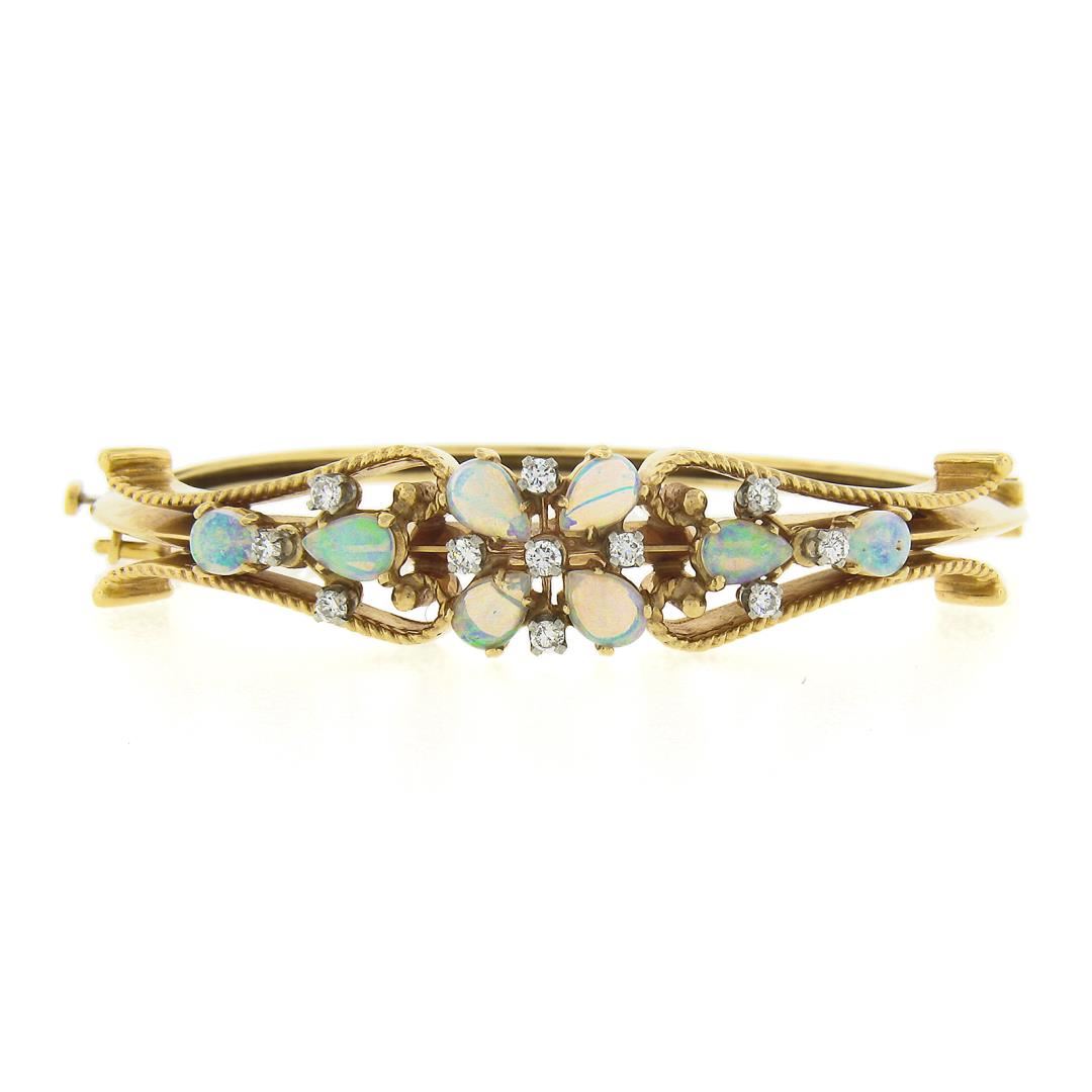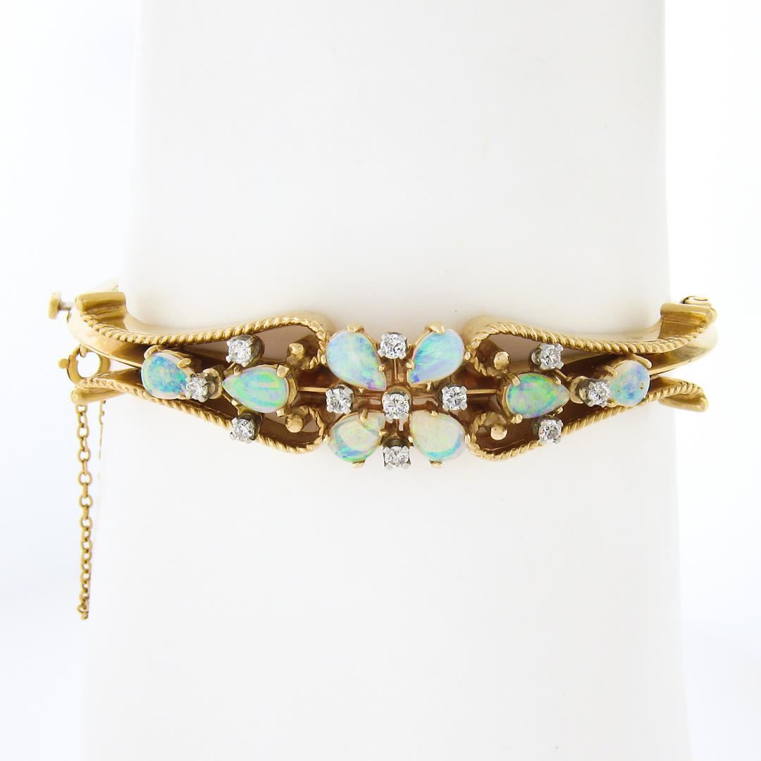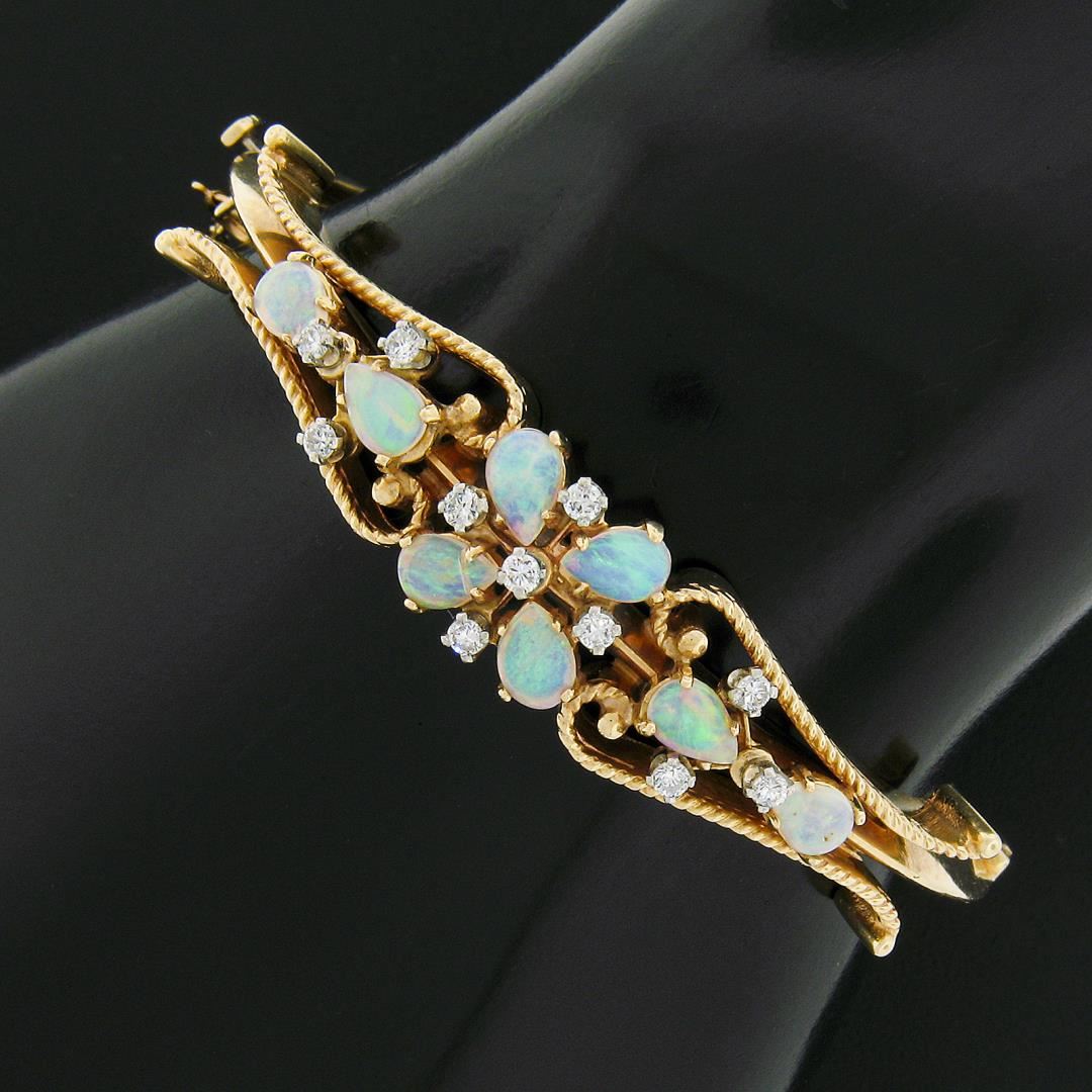 A vintage solid 14k yellow gold bangle bracelet, with 8 pear cabochon cut natrual opals (5.8x3.9mm), and 11 round & single cut natural diamonds (G/H - VS2-SI2 ; 0.30ctw ). It weighs a total of 22.63 grams, measures 12.5mm wide, and measures 6.25 inches in length.