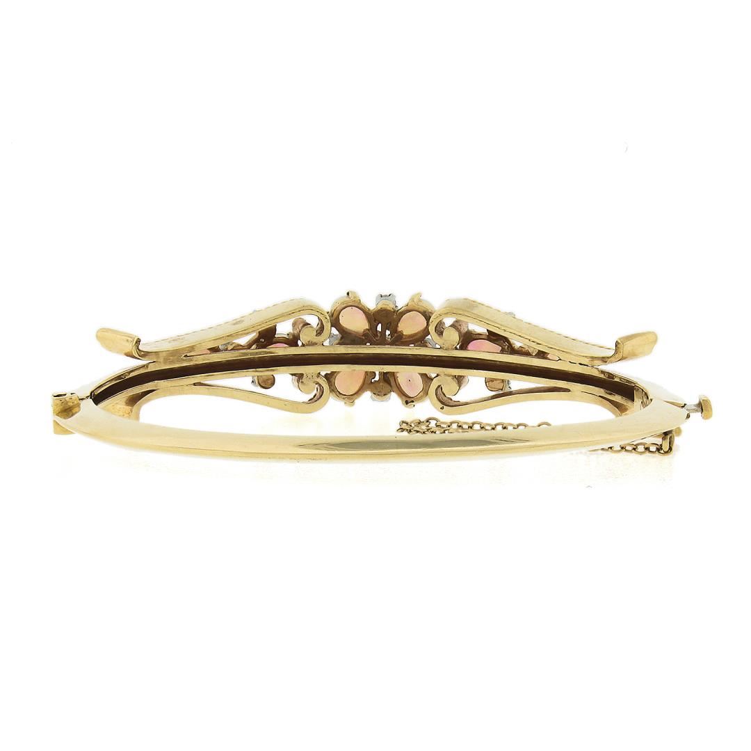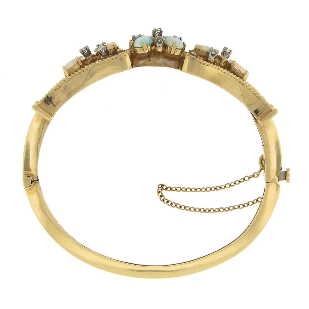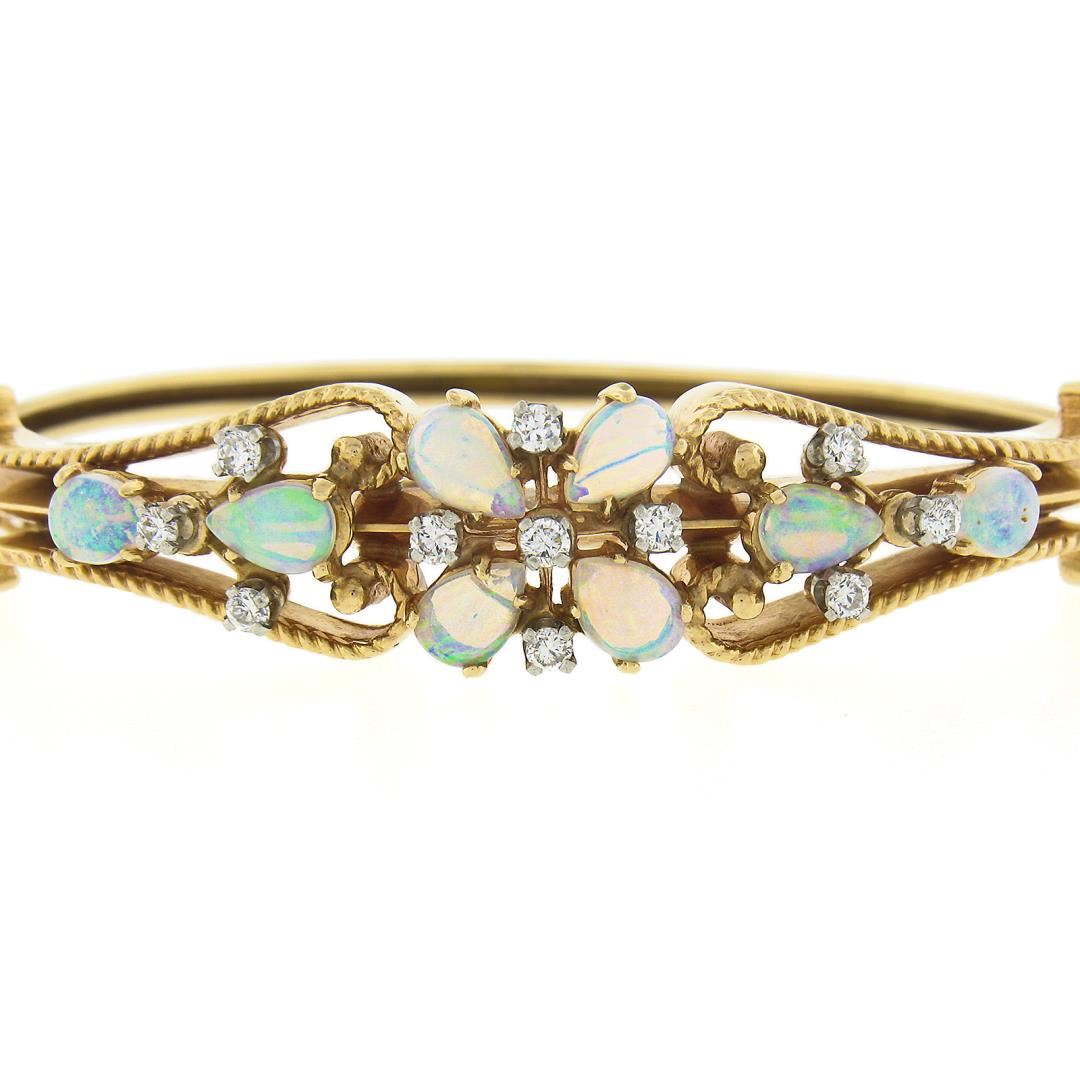 A vintage solid 14k yellow gold bangle bracelet, with 8 pear cabochon cut natrual opals (5.8x3.9mm), and 11 round & single cut natural diamonds (G/H - VS2-SI2 ; 0.30ctw ). It weighs a total of 22.63 grams, measures 12.5mm wide, and measures 6.25 inches in length.