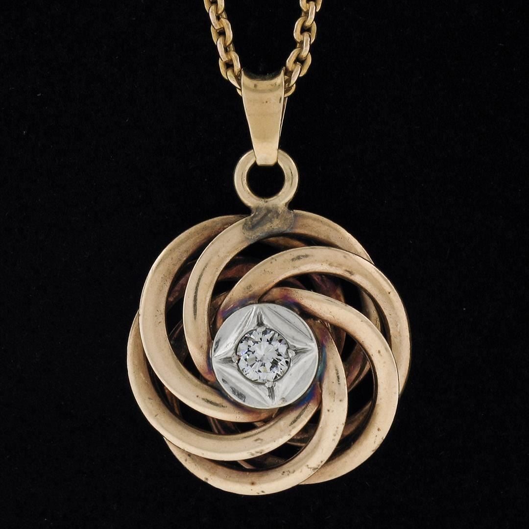 A vintage solid 14k rose, white and yellow gold love knot pendant necklace, with 1 round transitional cut natural diamond (F- VS2; 0.24ct). The pendant weighs a total of 6.70 grams, measures 26.0x17.65mm including the bail, and 16 inch cable link chain.