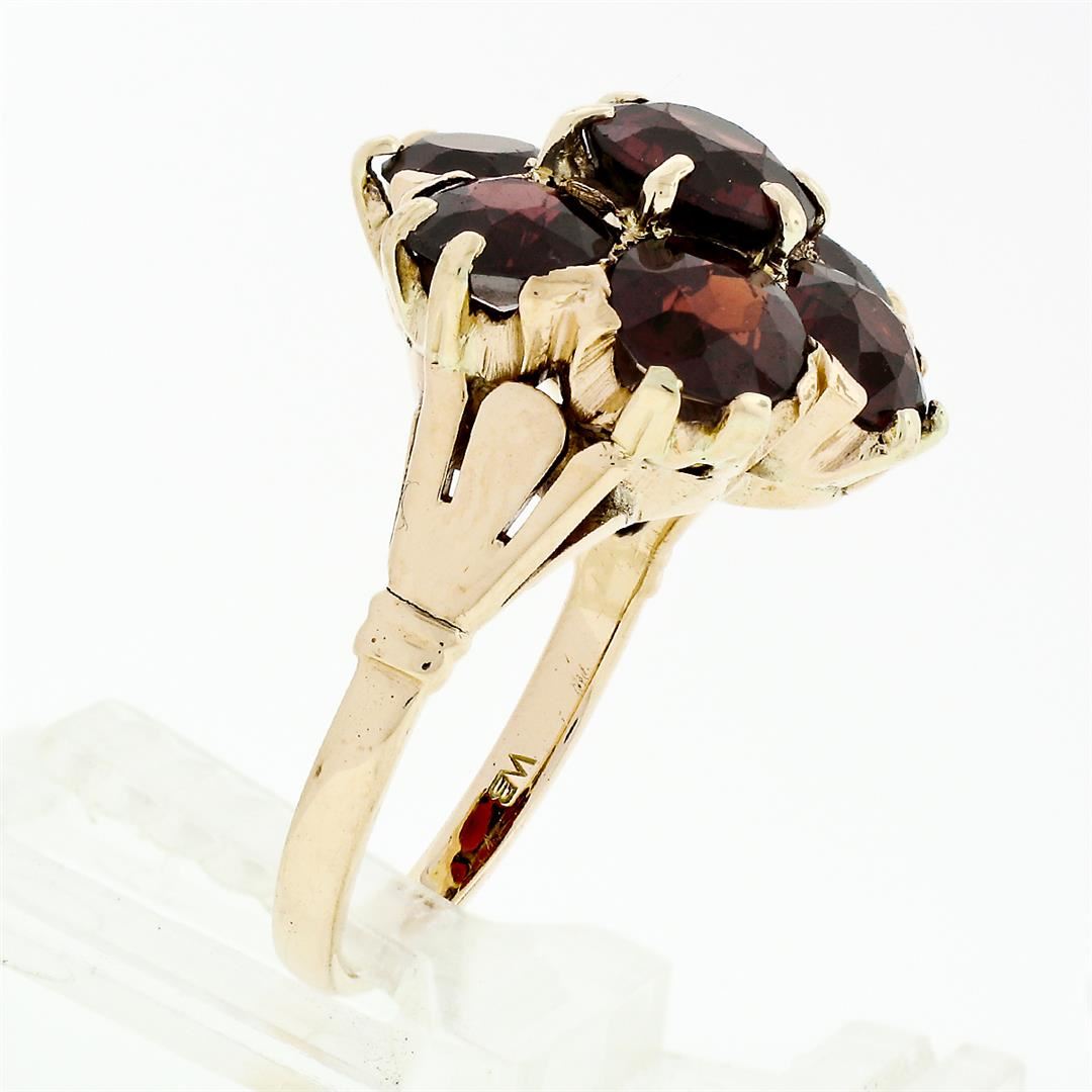 A vintage solid 14k yellow gold cluster flower ring, with 7 old round cut natural garnets (6mm to 7mm; 7.6ctw). The ring is size 7.0, weighs a total of 6.42 grams, and measures 18mm wide.