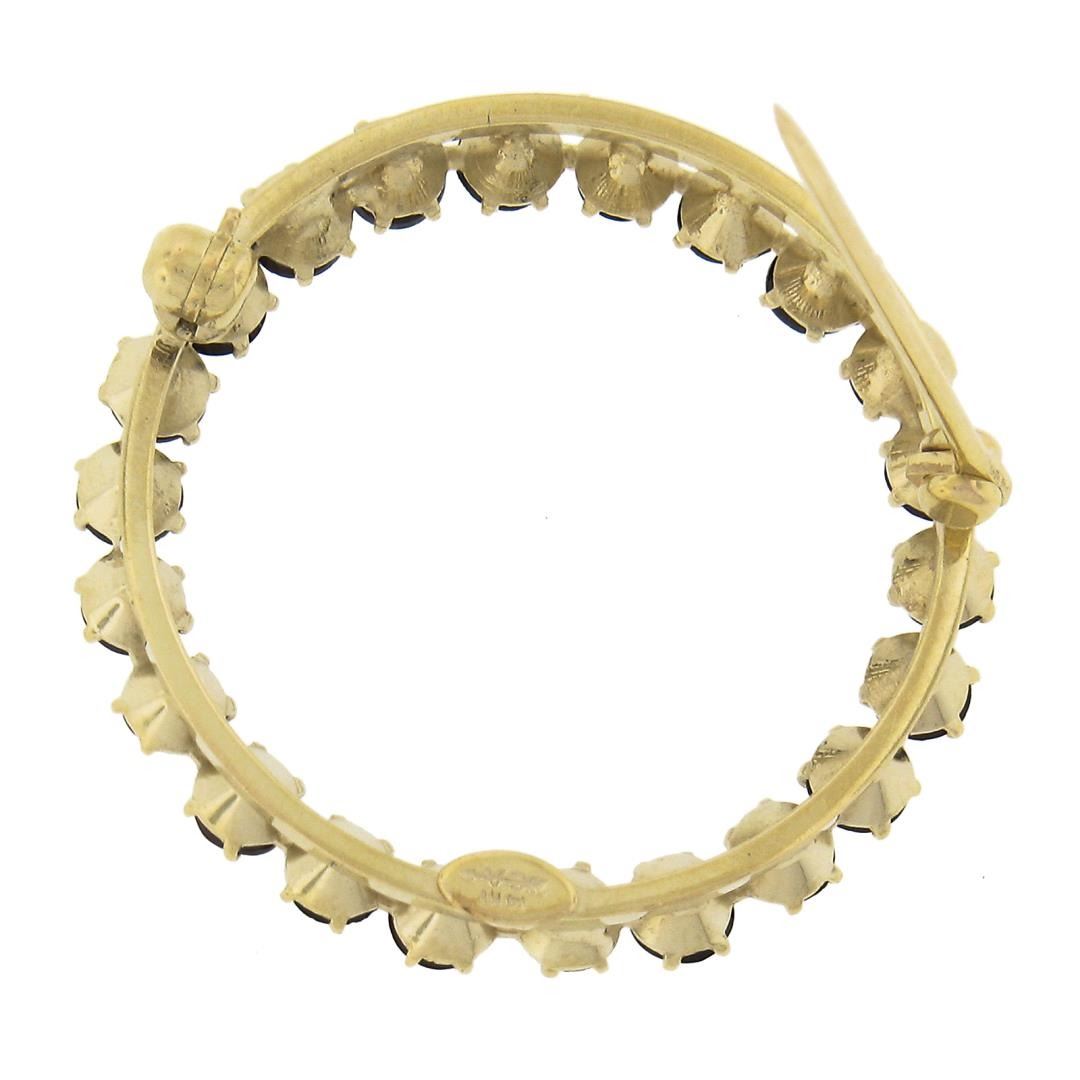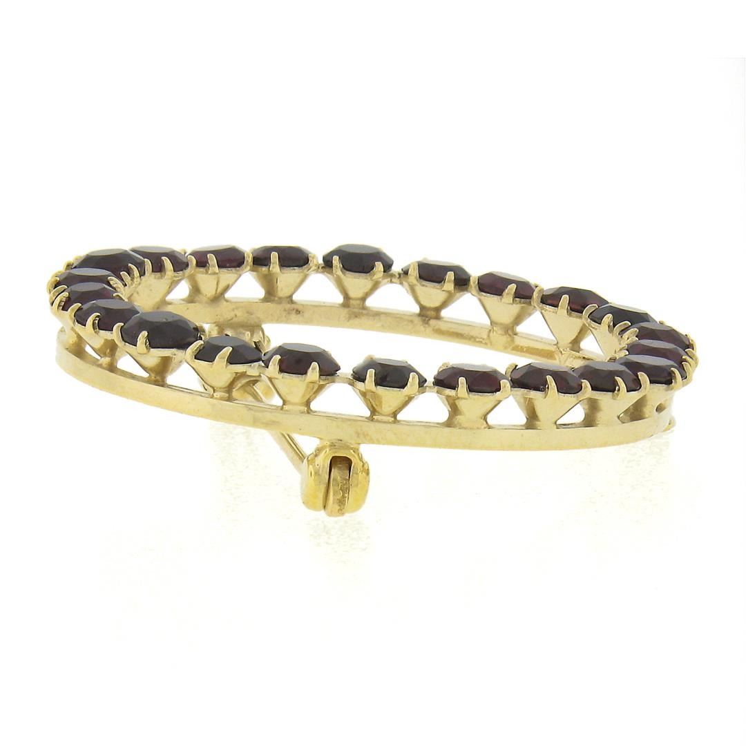 A vintage solid 14k yellow gold wreath brooch, featuring 22 round cut natural garnets (3.3ctw). Measures 27.7mm in diameter and weighs a total of 3.18 grams.