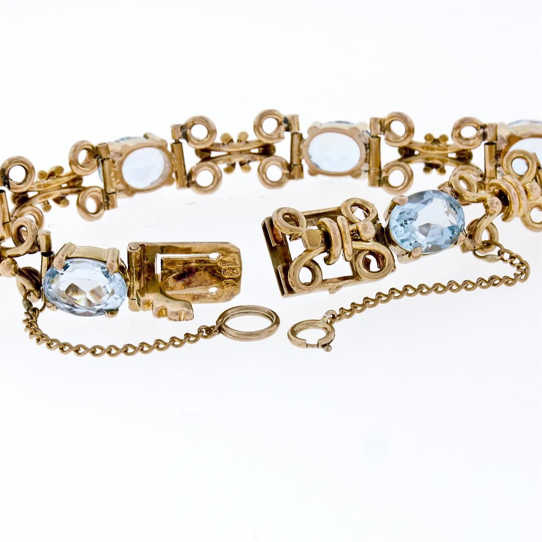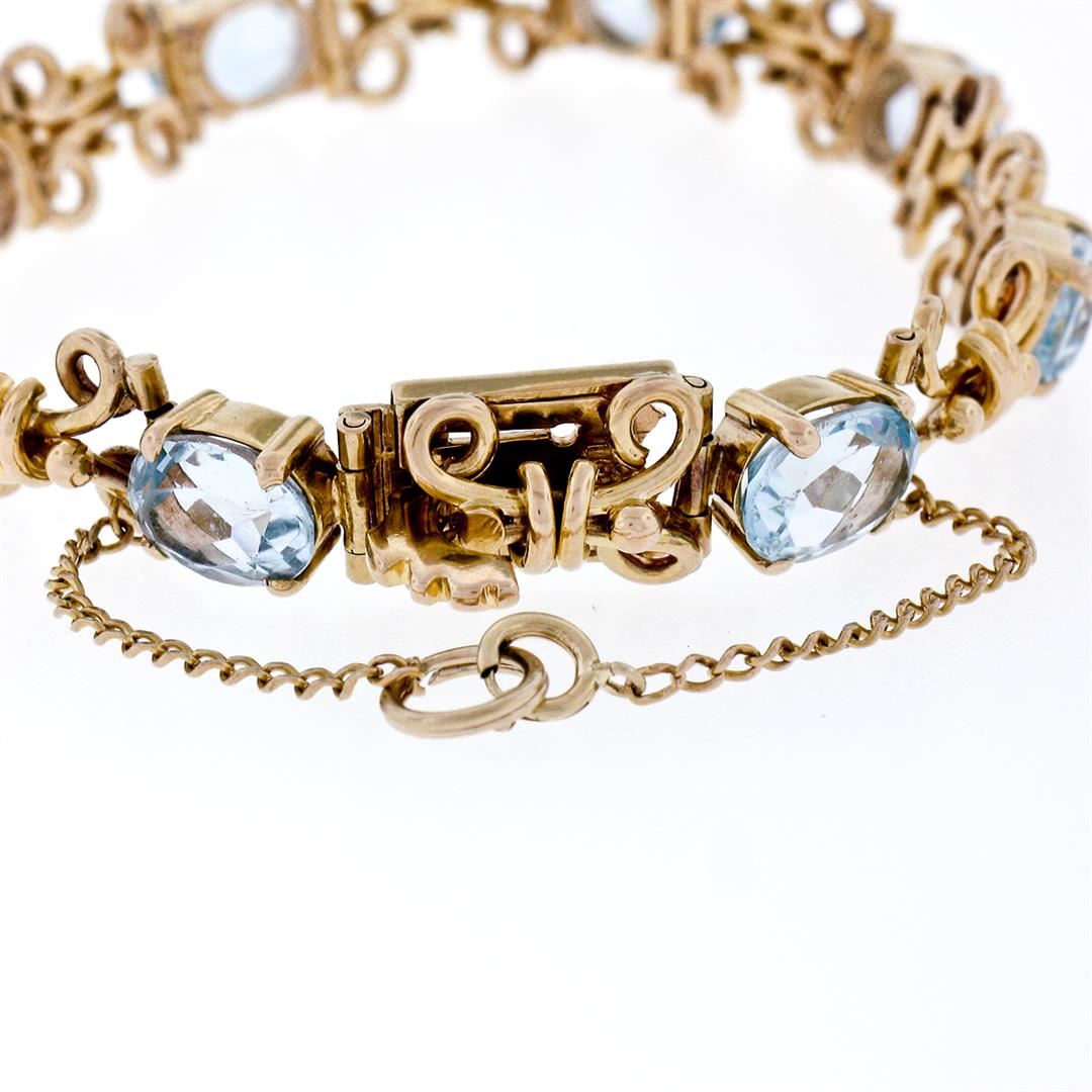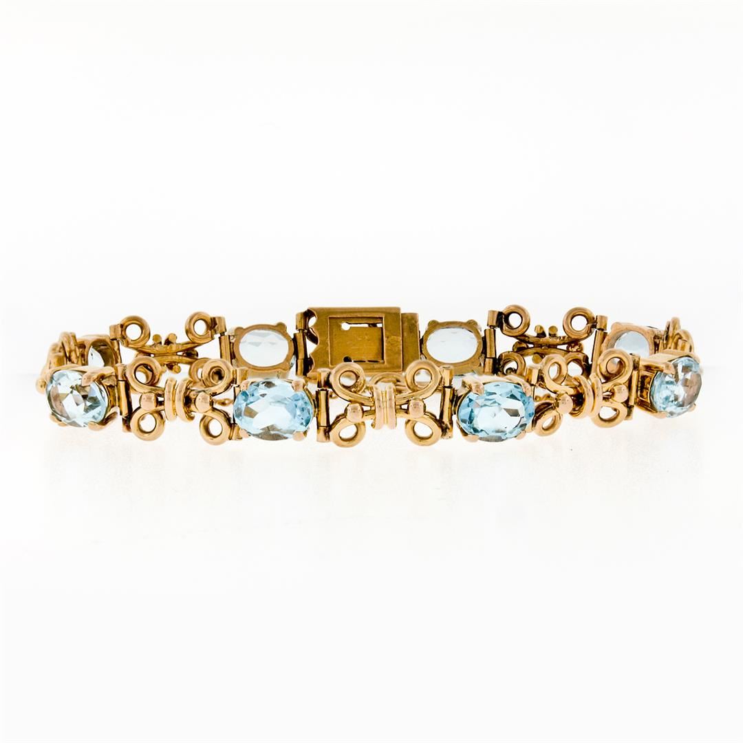 A vintage solid 18k yellow gold open link bracelet, with 8 oval cut natural aquamarine (8.0x6.0mm- 9.00ctw). It weighs a total of 17.88 grams, measures 8.70mm wide, and measures 6.5 inches in length.